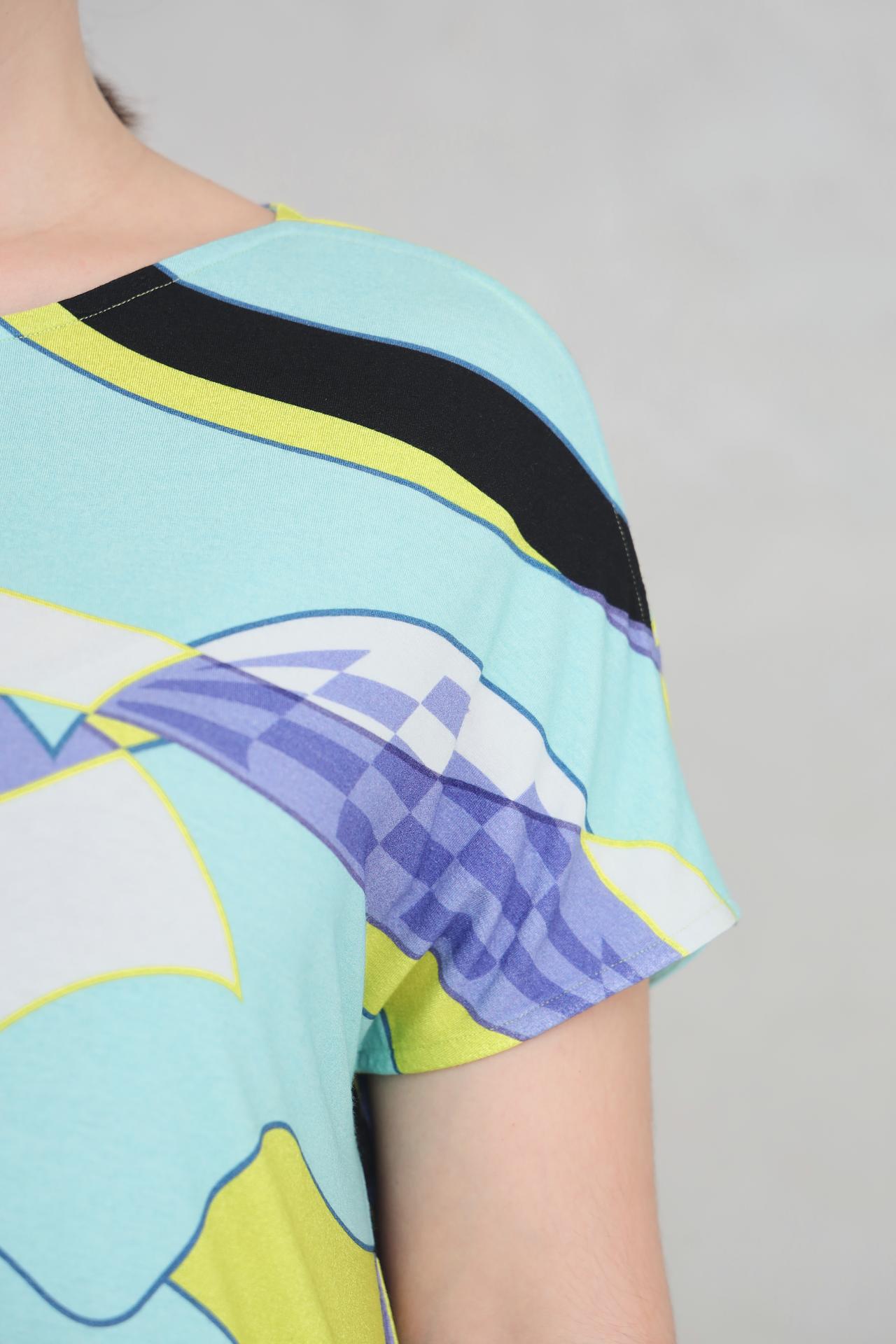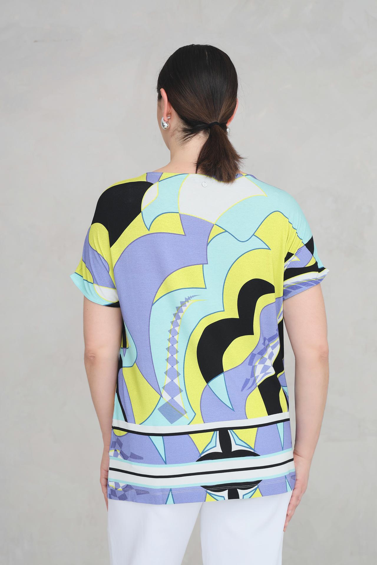 Разноцветный принт создает яркий и неповторимый образ, который подчеркнет вашу индивидуальность. Классический крой футболки подойдет для любого типа фигуры, обеспечивая свободу движений и комфорт в течение всего дня.
