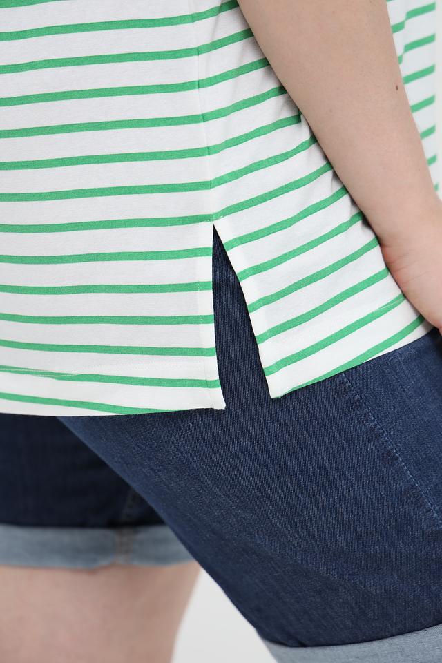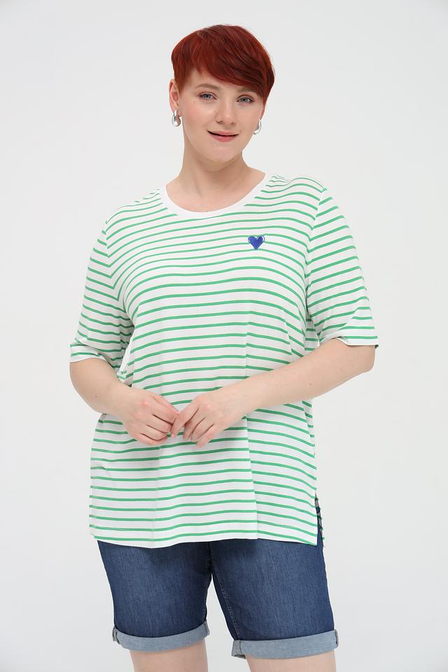 Женская футболка Frapp зеленого и белого цвета в полоску, украшена небольшим синим сердечком. Изготовлена из мягкой вискозы с добавлением эластана для комфорта и хорошей посадки. Состав: вискоза 90%, эластан 4%