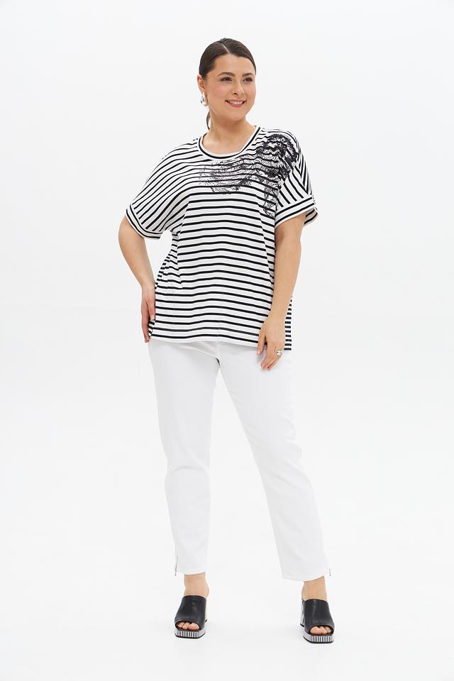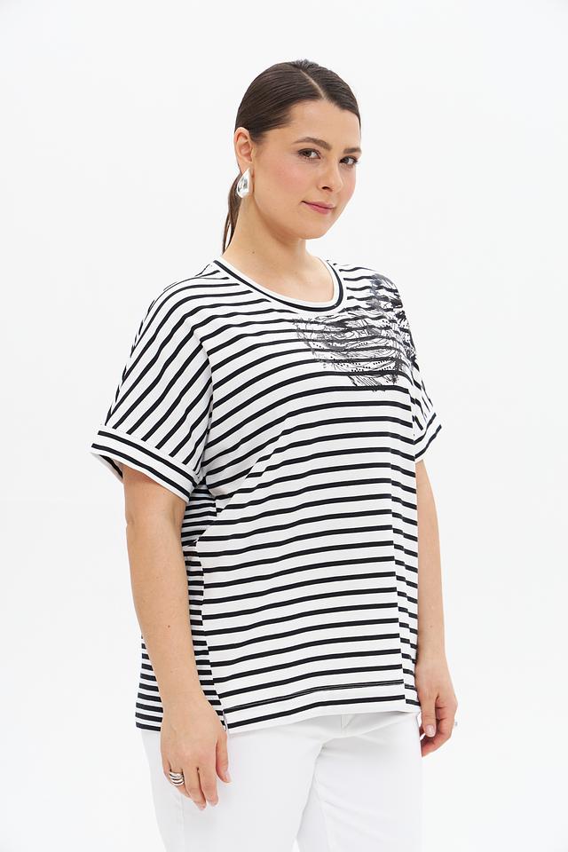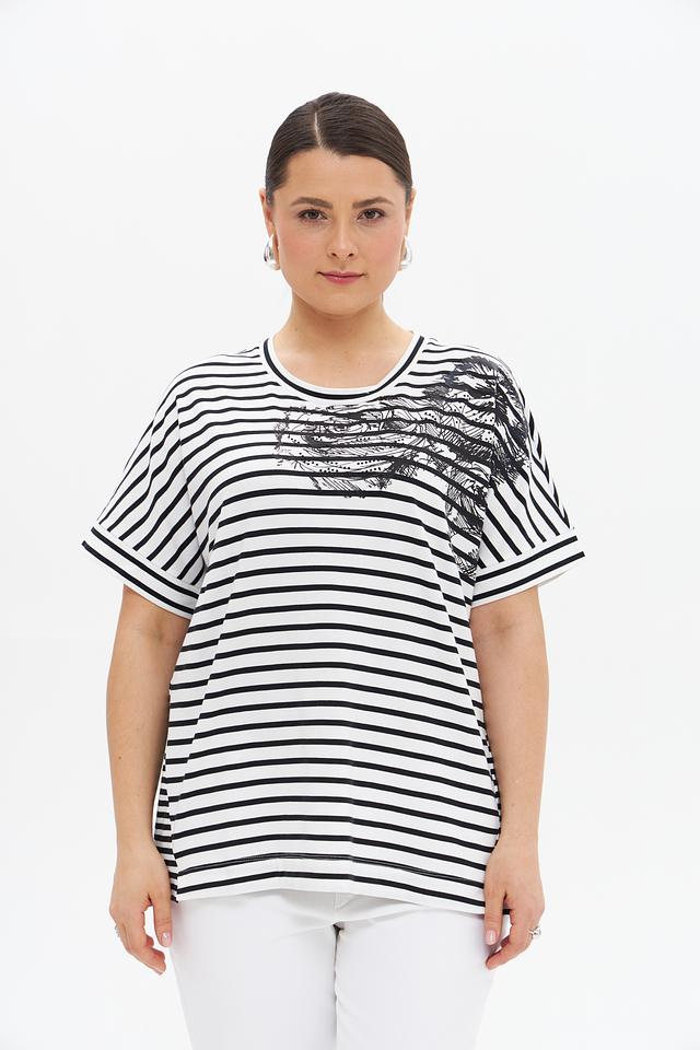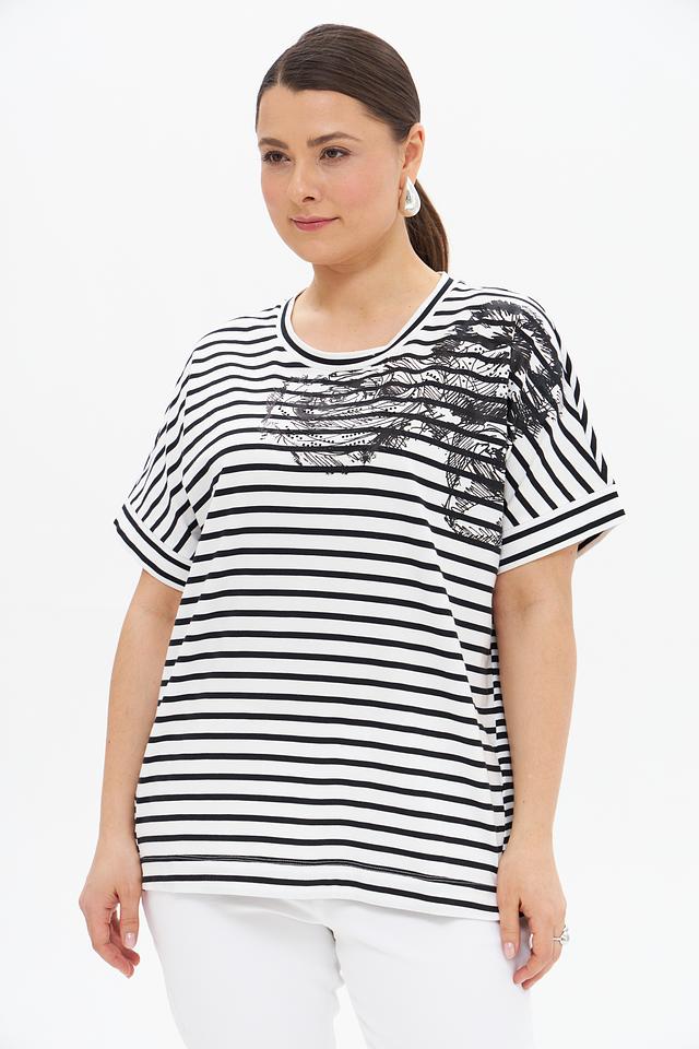 Женская футболка Frapp чёрно-белого цвета с ярким принтом. Изготовлена из мягкого хлопка с добавлением эластана для комфорта и лучшей посадки. Состав: хлопок 92%, эластан 8%