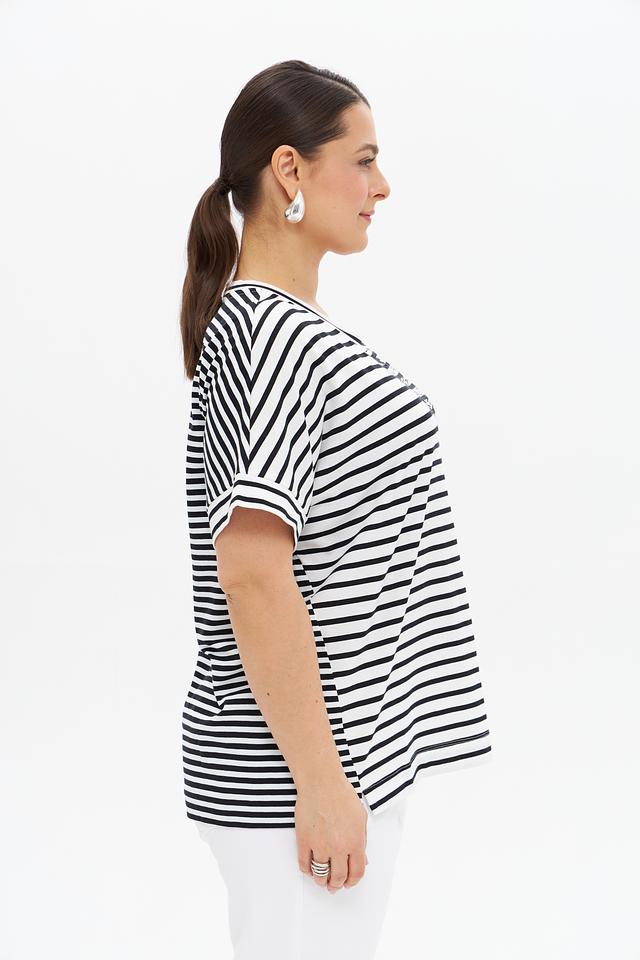 Эта стильная футболка от Frapp станет отличным дополнением к вашему гардеробу. Классический крой и сочетание чёрно-белой полоски делают её универсальной и подходящей для различных образов.