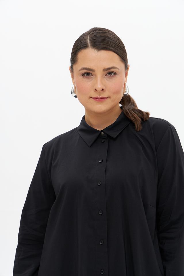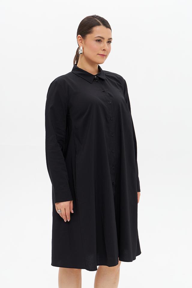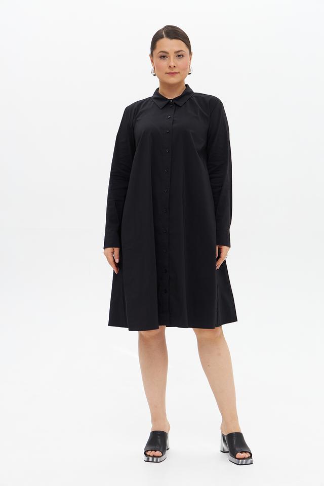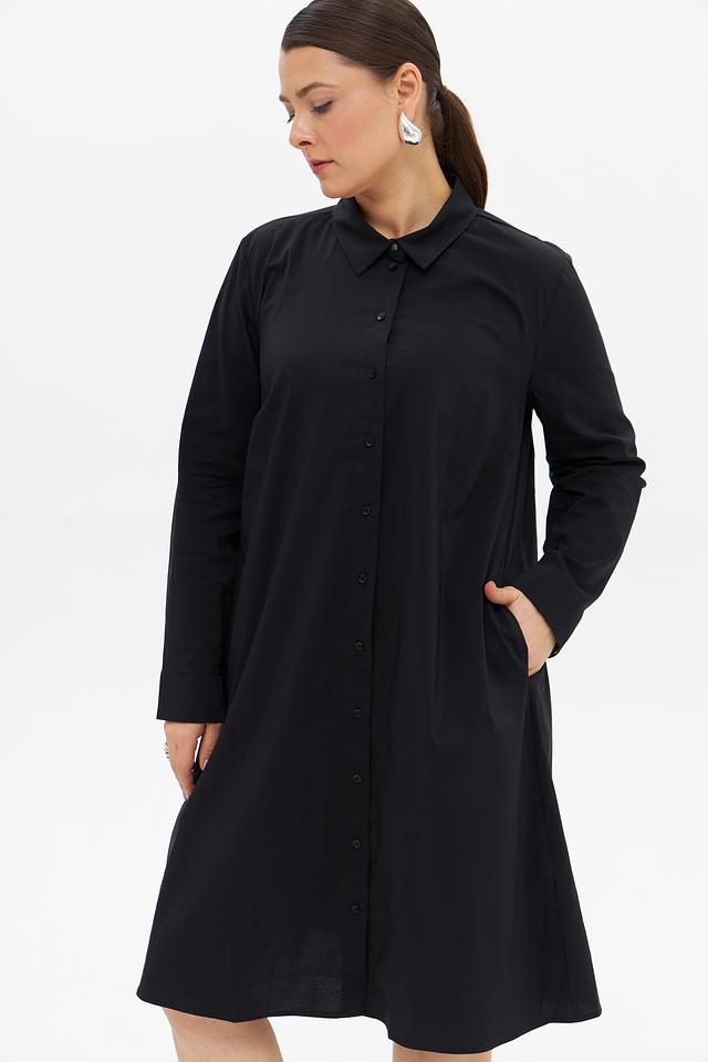 Это платье-рубашка от бренда Frapp выполнено в классическом чёрном цвете. Модель имеет прямой силуэт, длину до колена и длинные рукава с манжетами.