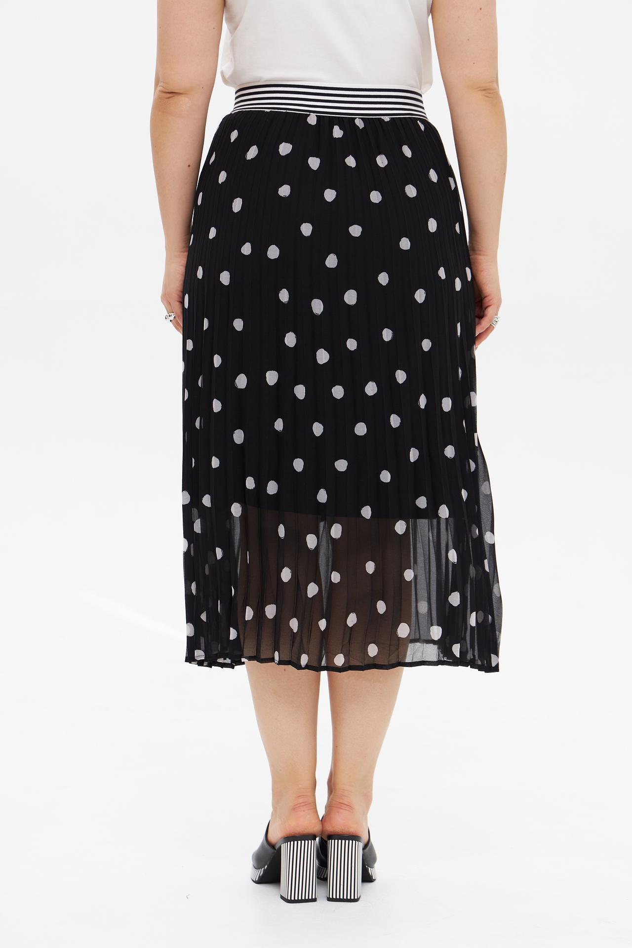 - Дизайн: Плиссированная юбка миди длины с принтом в белый горошек. Модель имеет эластичный пояс в полоску, который обеспечивает комфортную посадку.