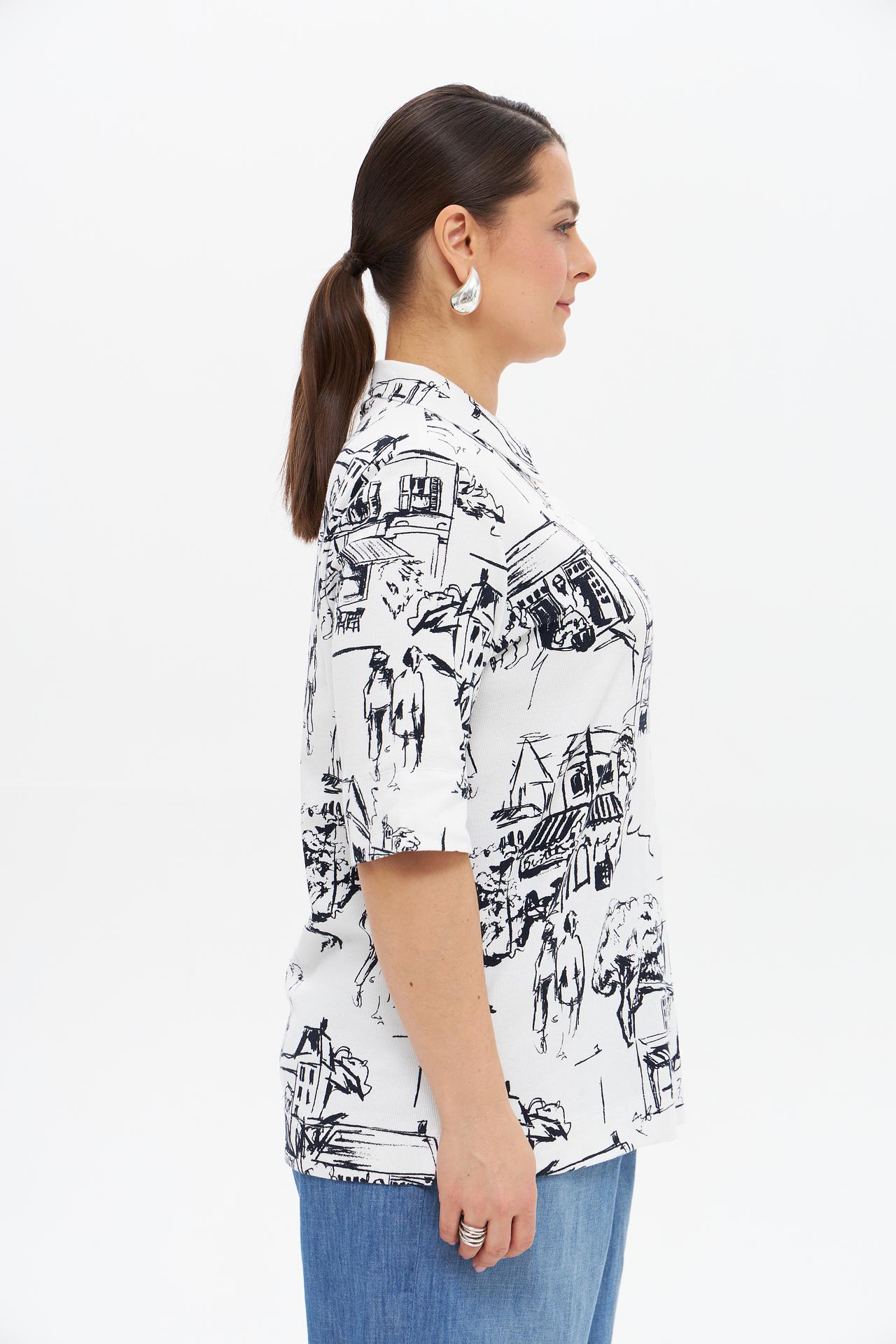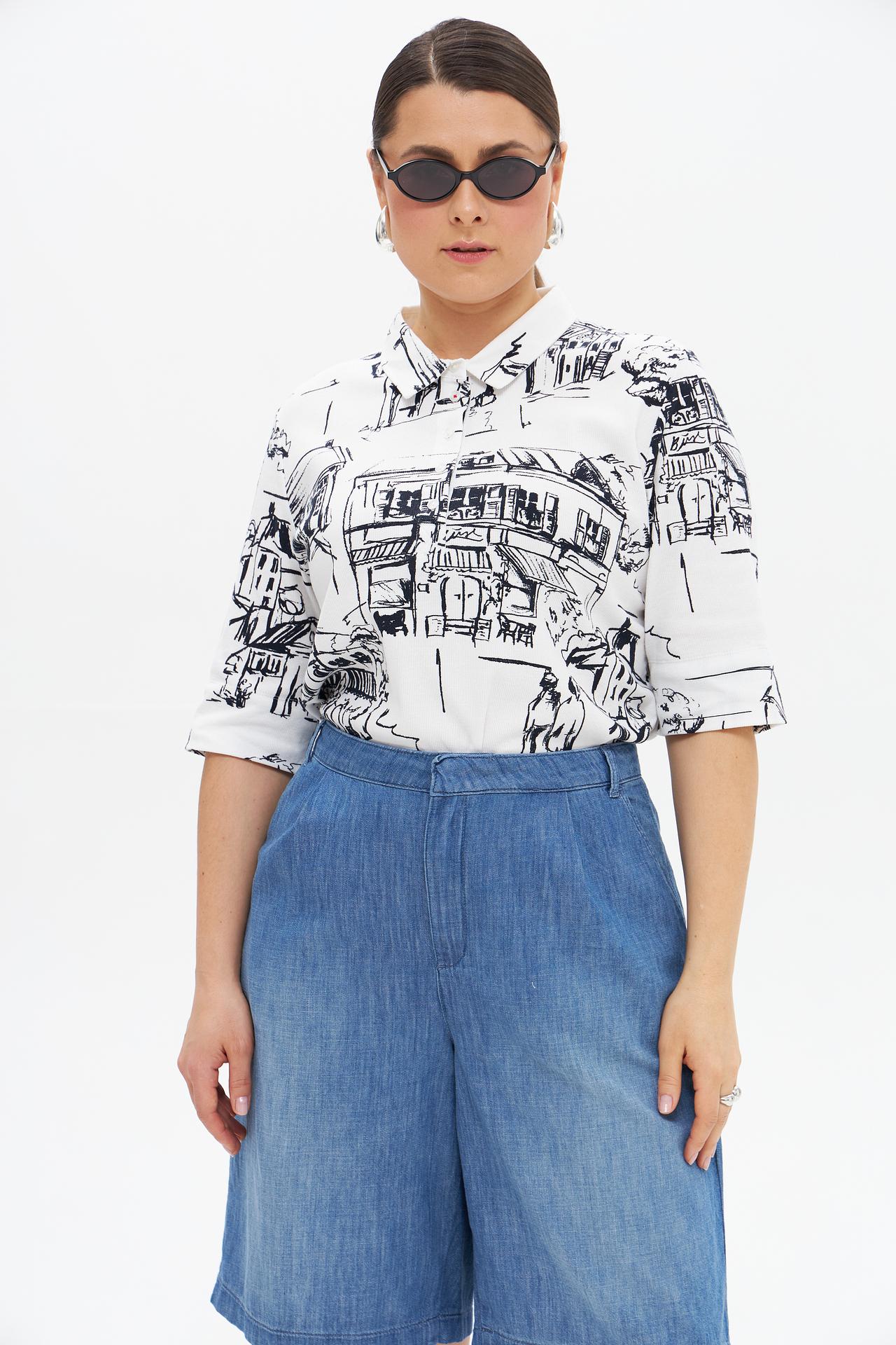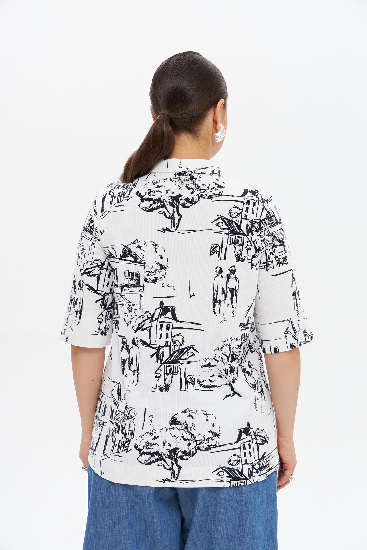 - Уникальный дизайн: Рисунок с городским пейзажем делает эту футболку неповторимой и запоминающейся.