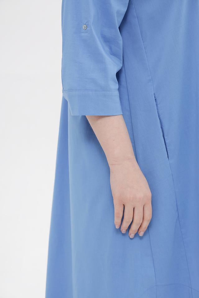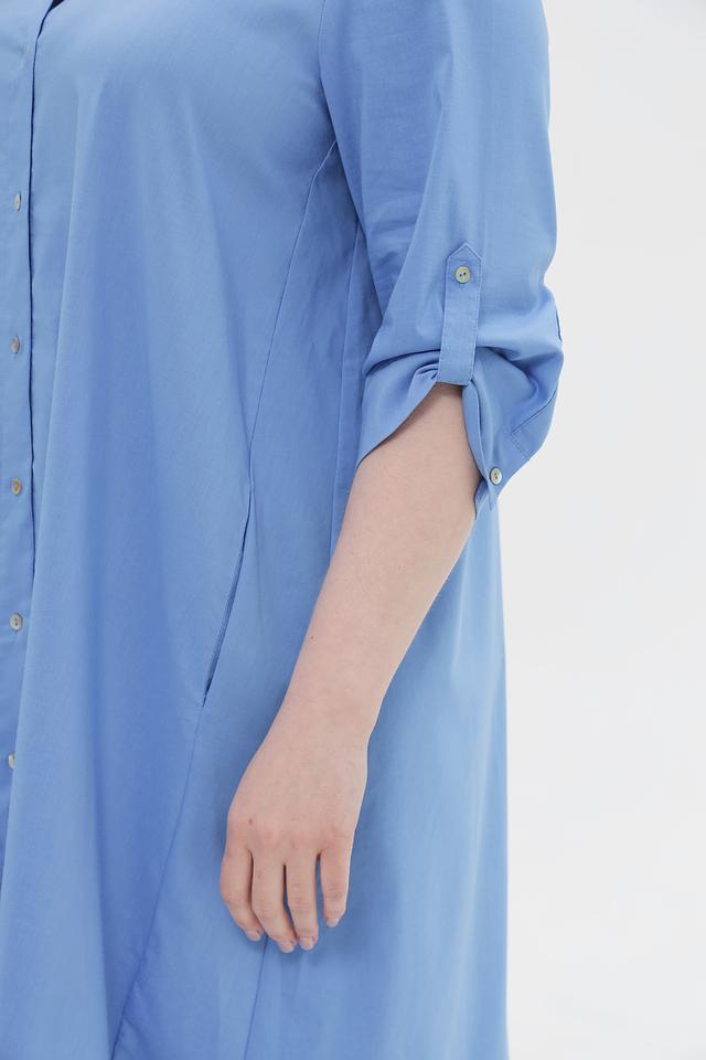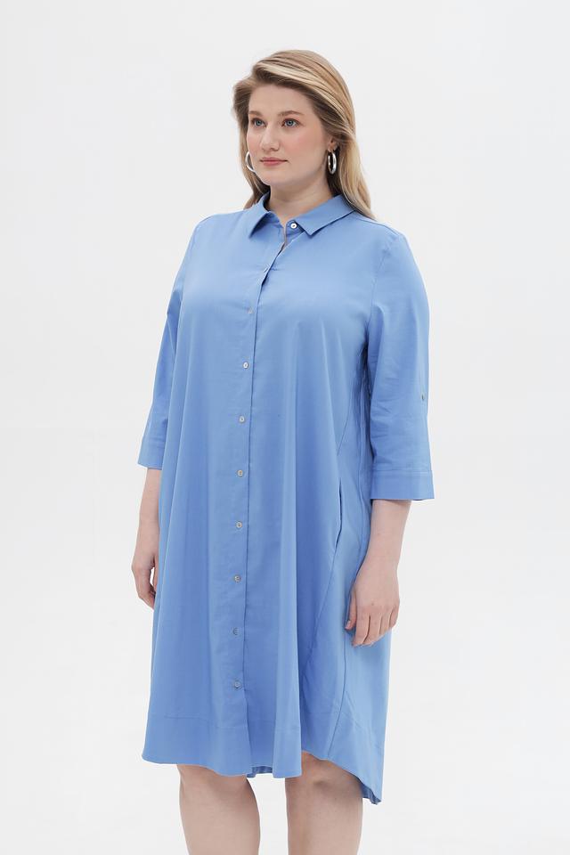 Модель имеет прямой силуэт, воротник рубашка и застегивается на пуговицы по всей длине. Рукава длиной 3/4 с манжетами, которые можно регулировать при помощи пуговиц. Платье имеет асимметричный подол, который придает образу динамичность.