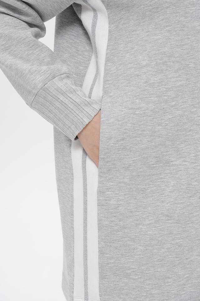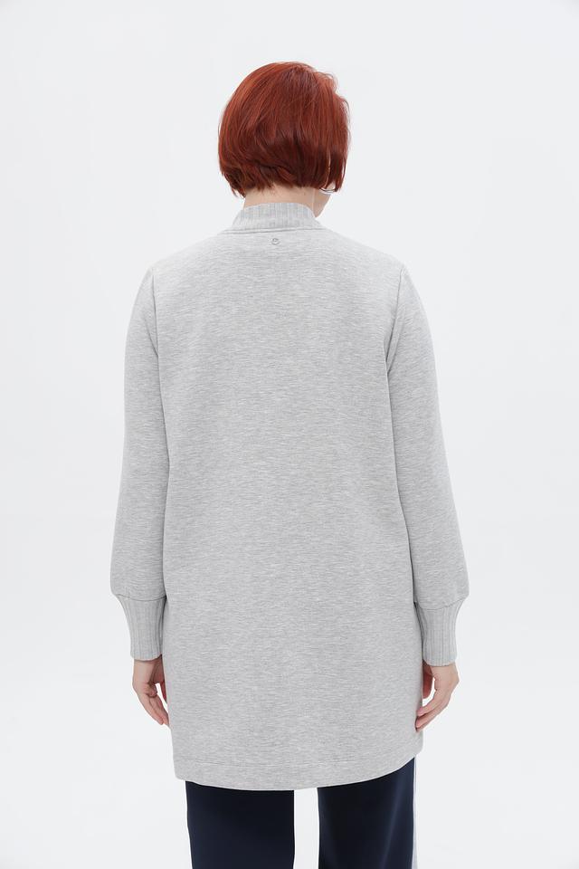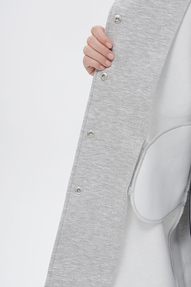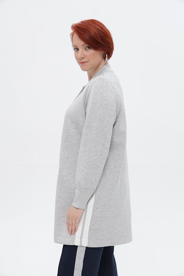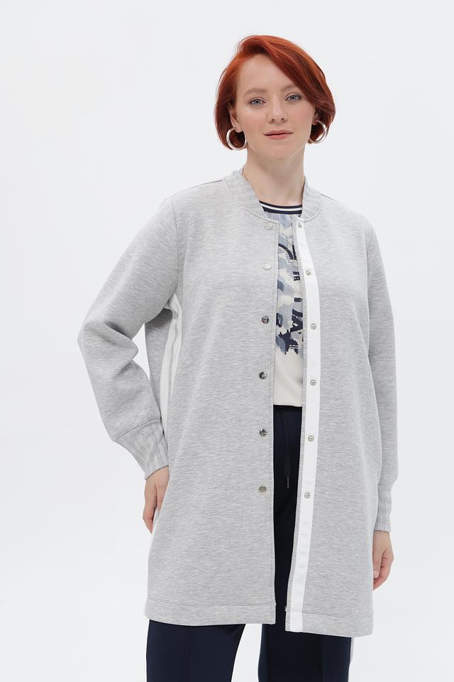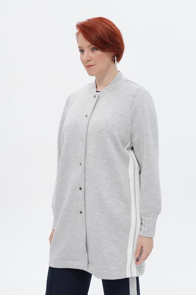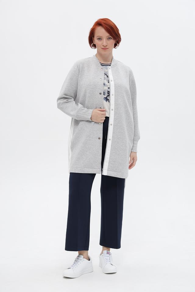 Жакет имеет удлиненный силуэт и застегивается на пуговицы по всей длине. Воротник-стойка придает изделию лаконичный вид. Контрастные полоски на рукавах и сбоку добавляют динамичности образу.