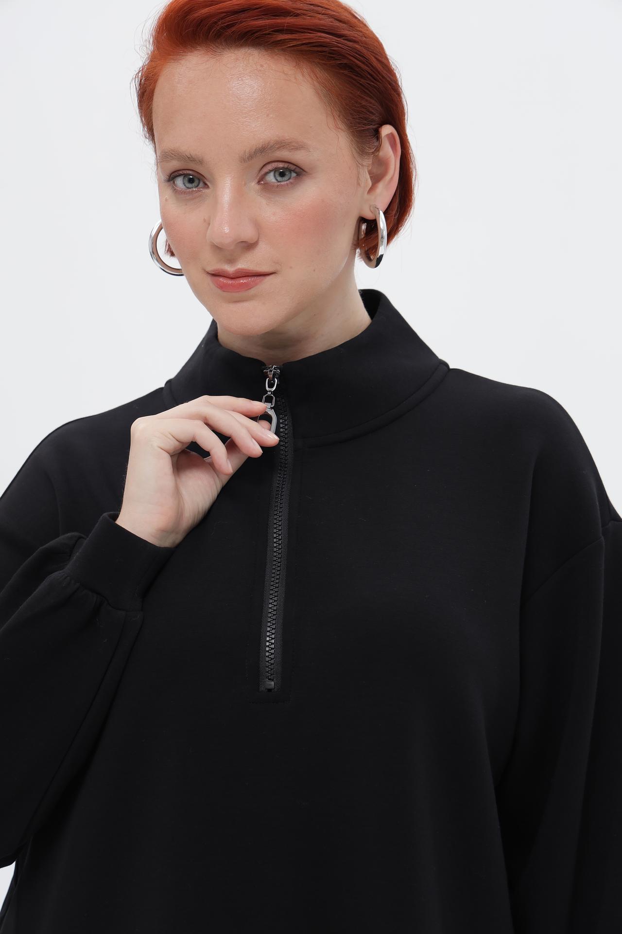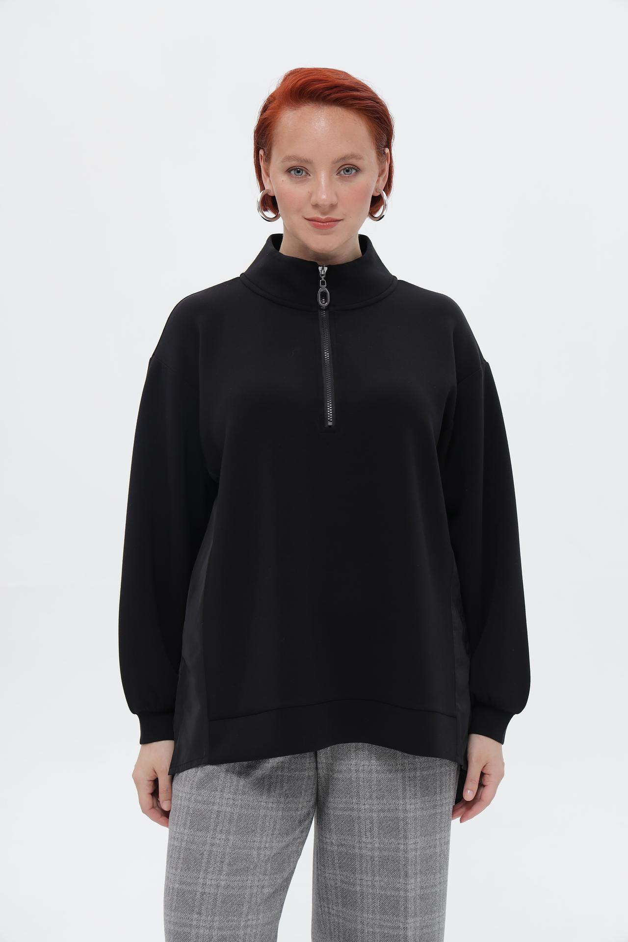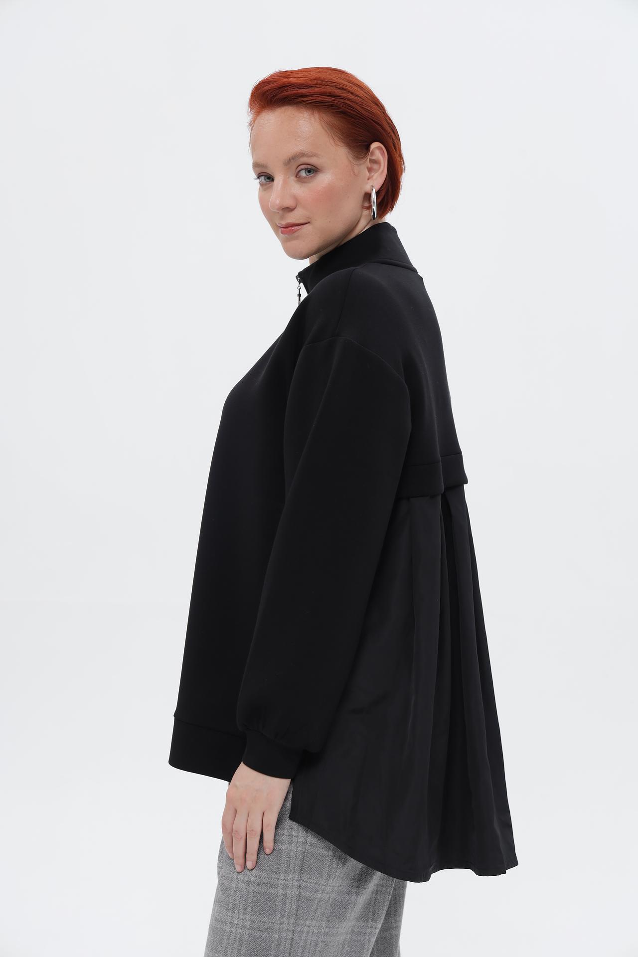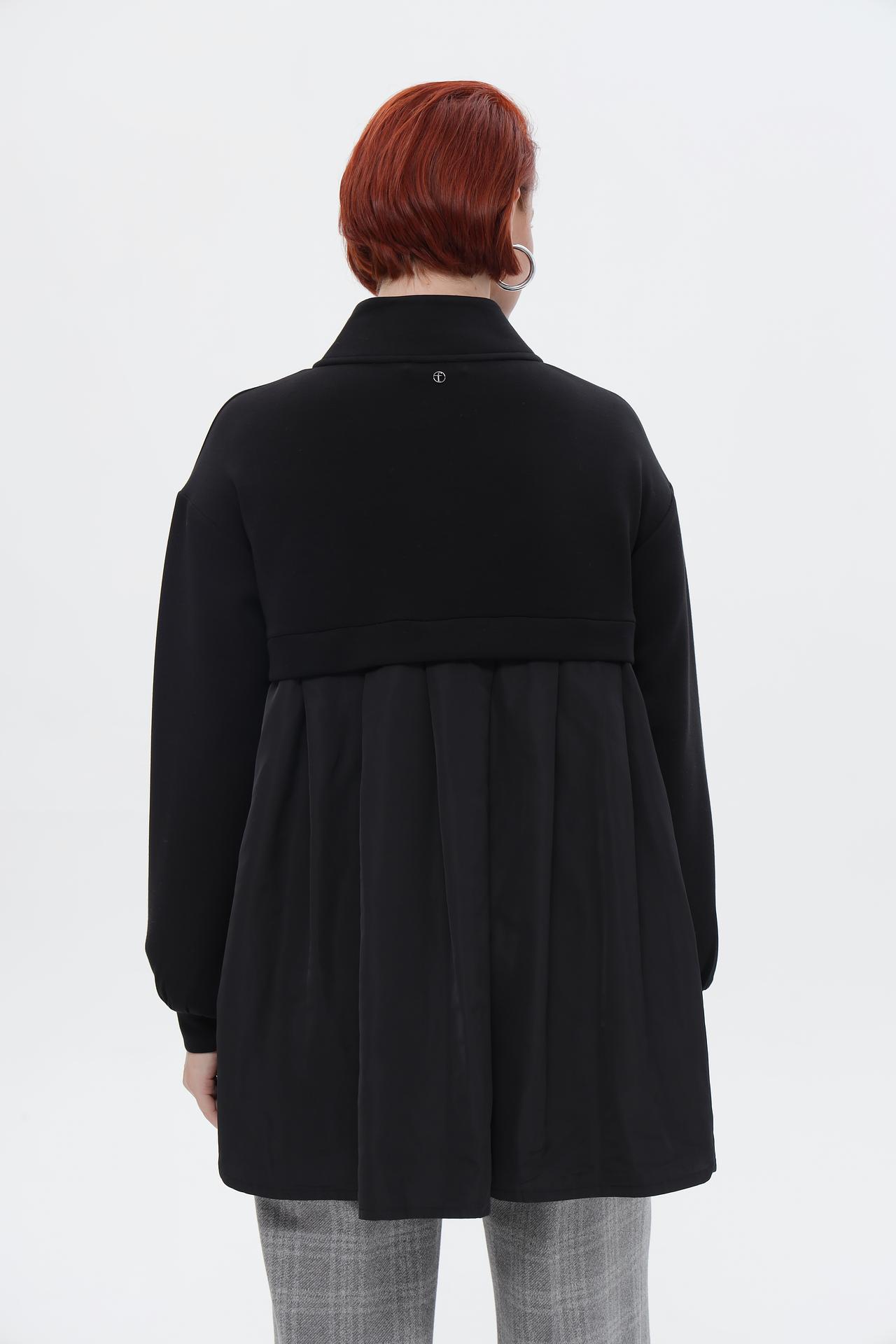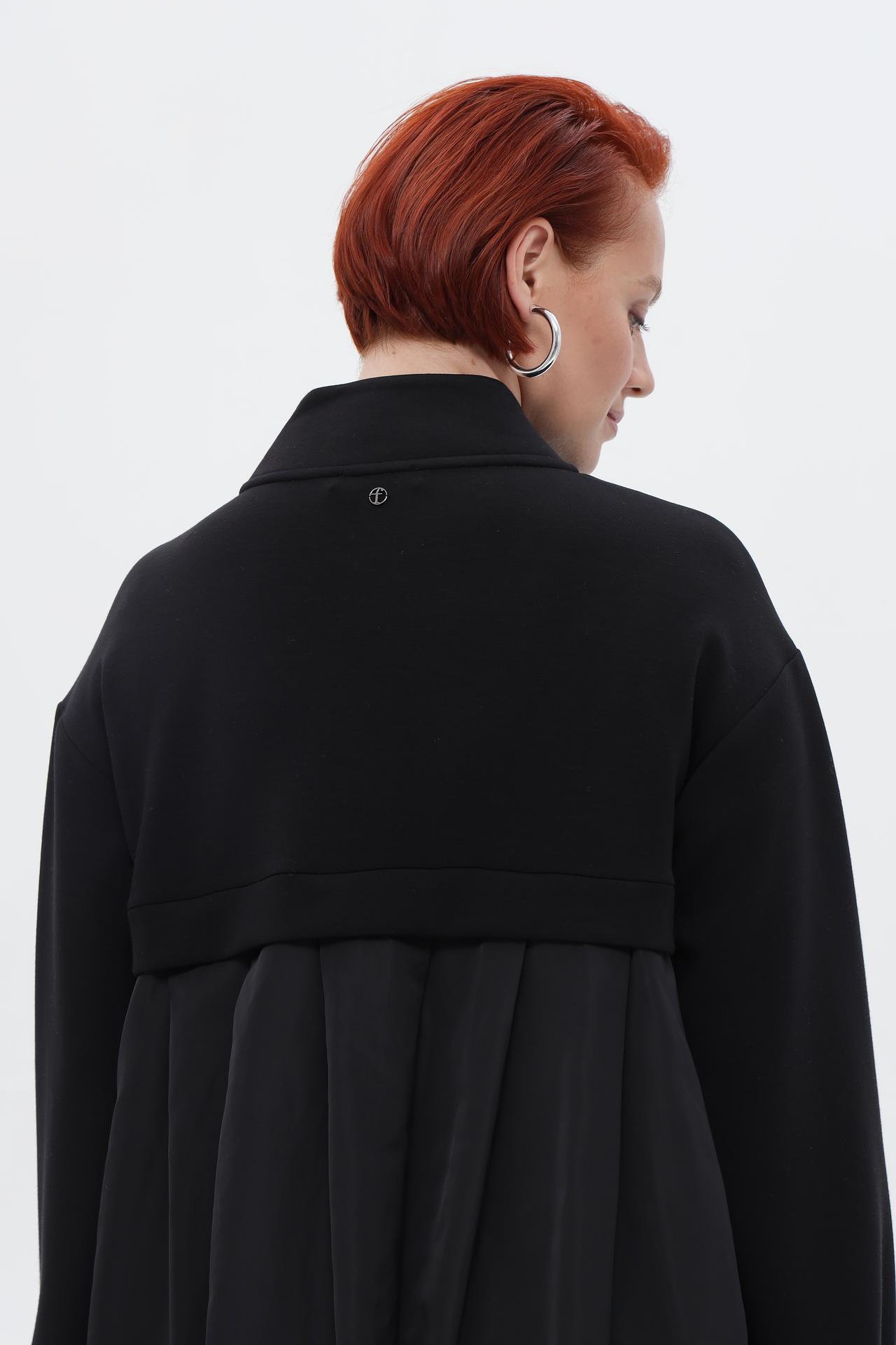 - Дизайн и крой: Модель имеет свободный крой, высокий воротник-стойку и удобную застежку-молнию на груди. Асимметричный подол и декоративные складки на спине придают изделию оригинальность и женственность.