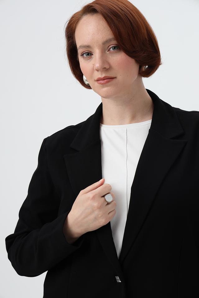 Классический чёрный жакет Frapp оверсайз кроя — идеальный выбор для создания стильных и современных образов. Модель имеет лаконичный дизайн без лишних деталей, что делает её универсальной и подходящей для различных случаев.