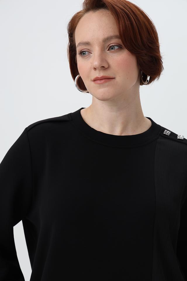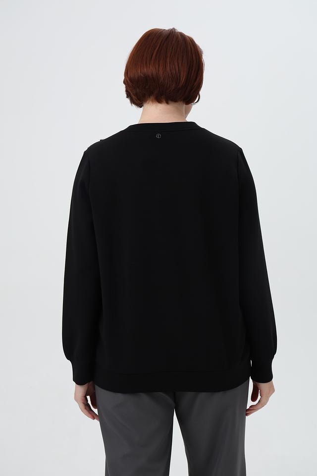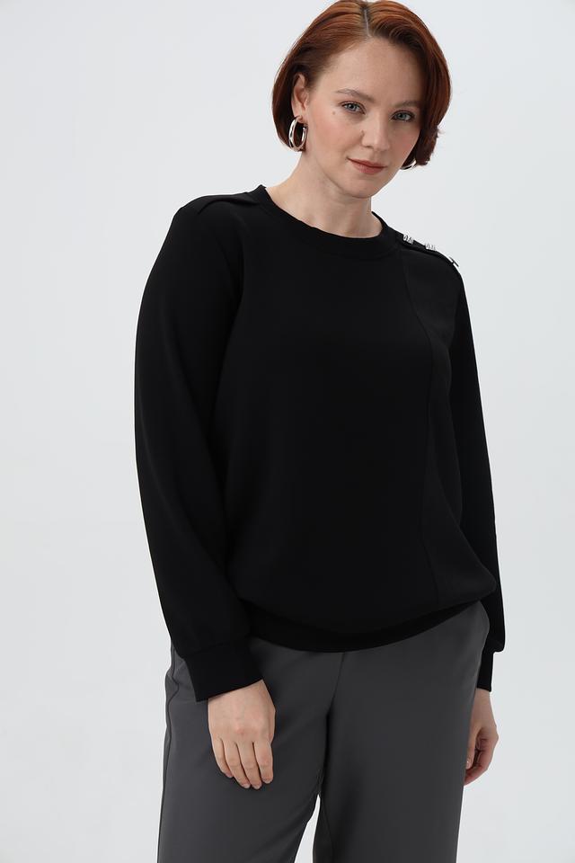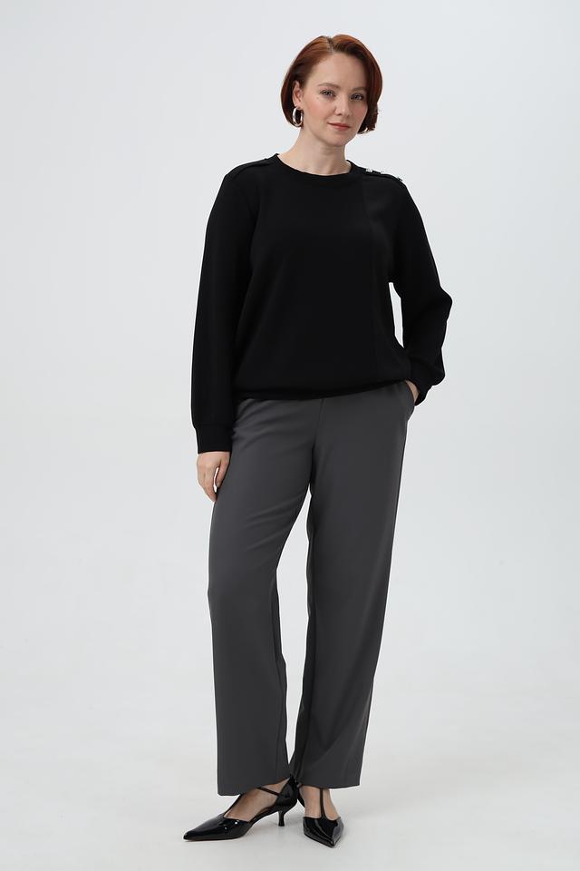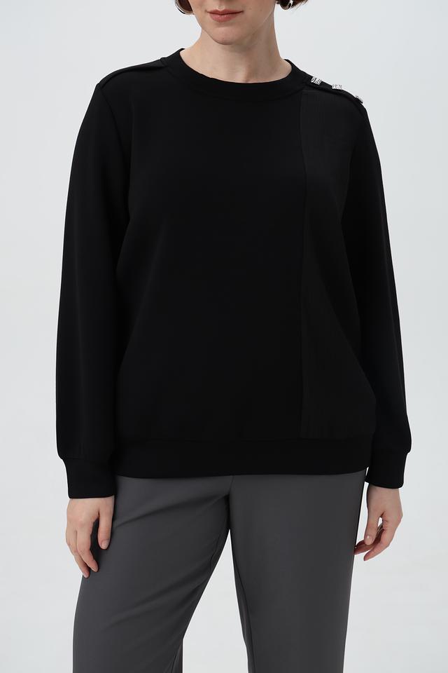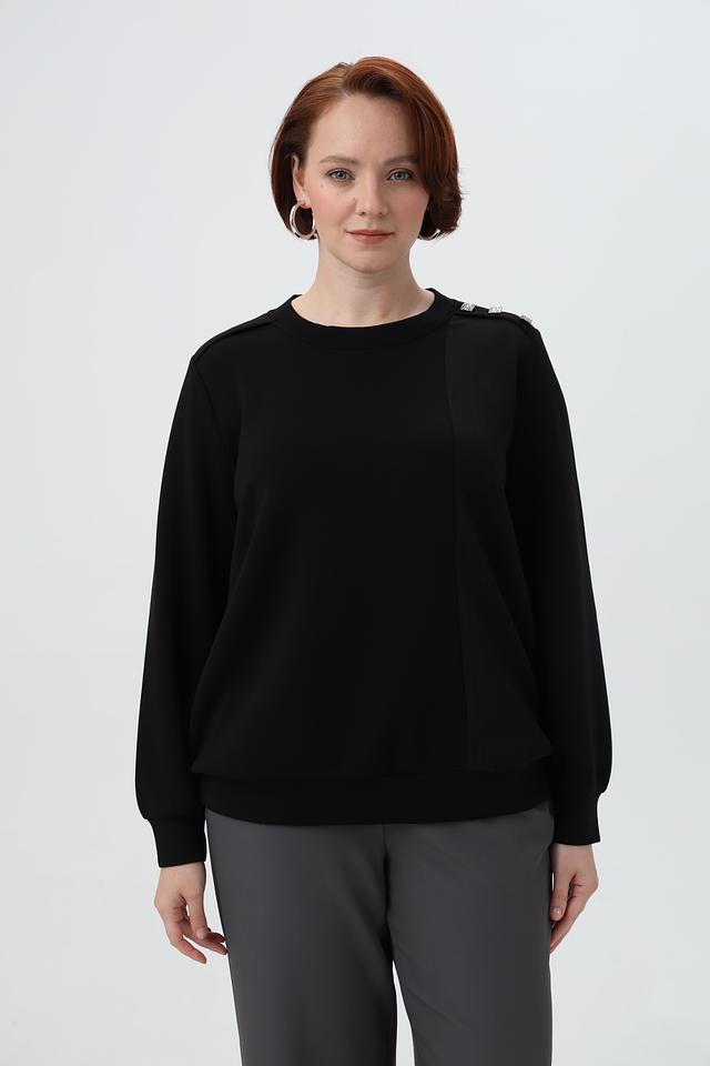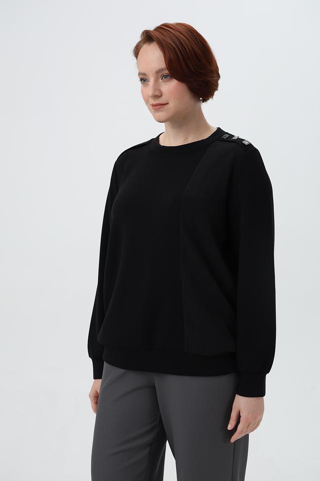 Пуловер имеет свободный крой, круглый вырез горловины и длинные рукава. Оригинальный акцент в дизайне — декоративные элементы на плечах, которые добавляют образу изюминку.