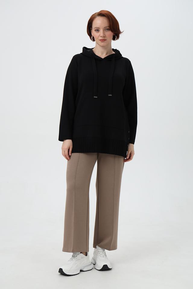 Худи имеет капюшон со шнурками для регулировки, а также вместительный карман. Оригинальным элементом дизайна являются разрезы по бокам с застёжкой на пуговицы, которые добавляют образу динамичности. Внизу худи расположена вязка-резинка.