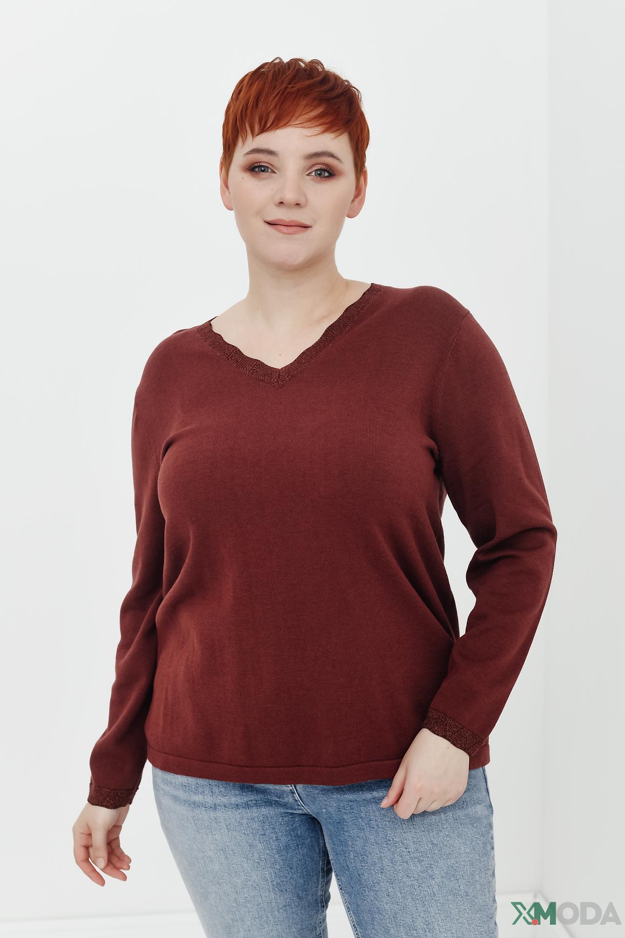 - Элегантный дизайн: Прямой крой и классический V-образный вырез делают пуловер универсальным для любой фигуры, включая большие размеры. Изящная блестящая окантовка ворота и манжет добавляет утонченности и акцента.