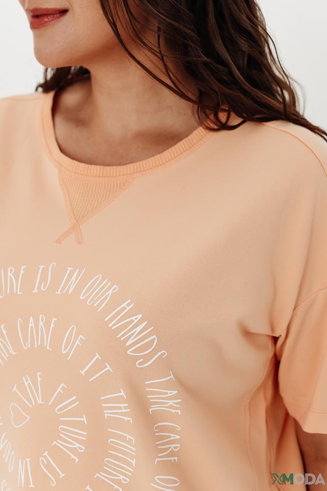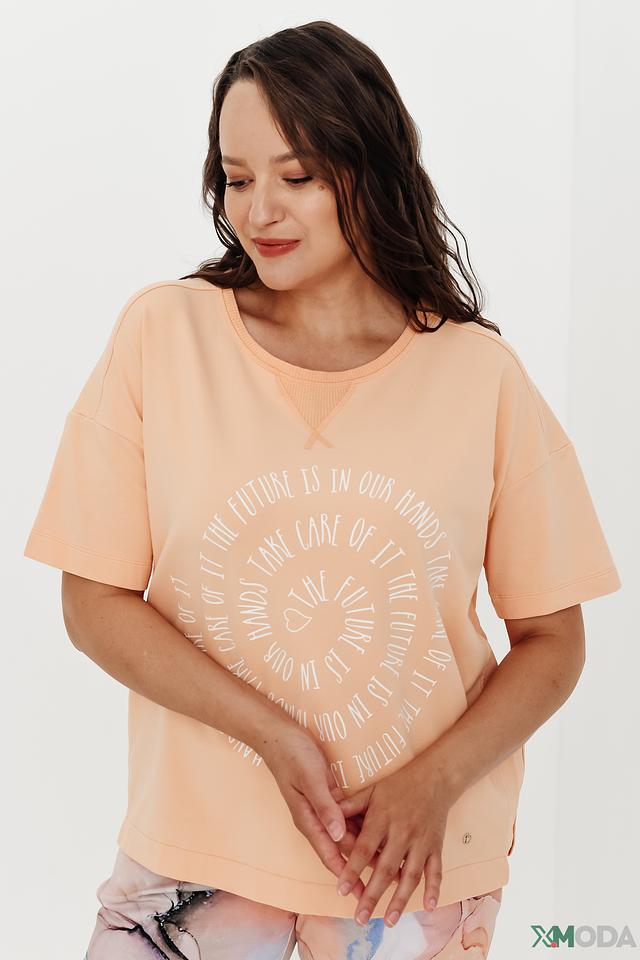 Женская футболка Frapp персикового цвета с оригинальным круглым принтом. Модель оверсайз из мягкого хлопка с добавлением эластана обеспечит комфорт и свободу движений. Состав: хлопок 95%, эластан 5%