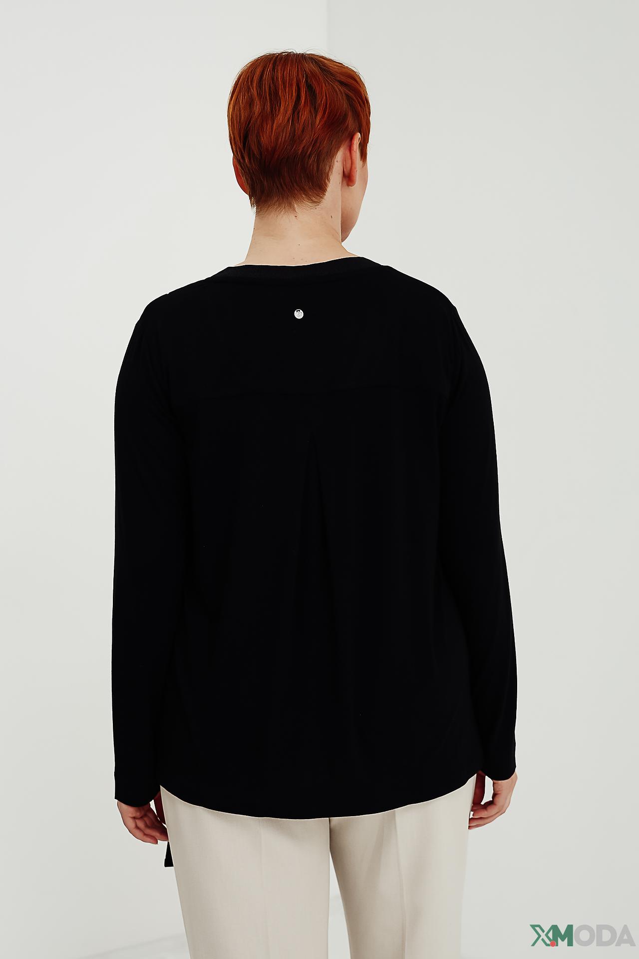 Блуза имеет V-образный вырез горловины, который визуально удлиняет шею и подчеркивает зону декольте. Длинные рукава и прямой крой обеспечивают свободу движений и комфортную посадку по фигуре. По бокам предусмотрены декоративные завязки, которые добавляют образу женственности и позволяют регулировать посадку.