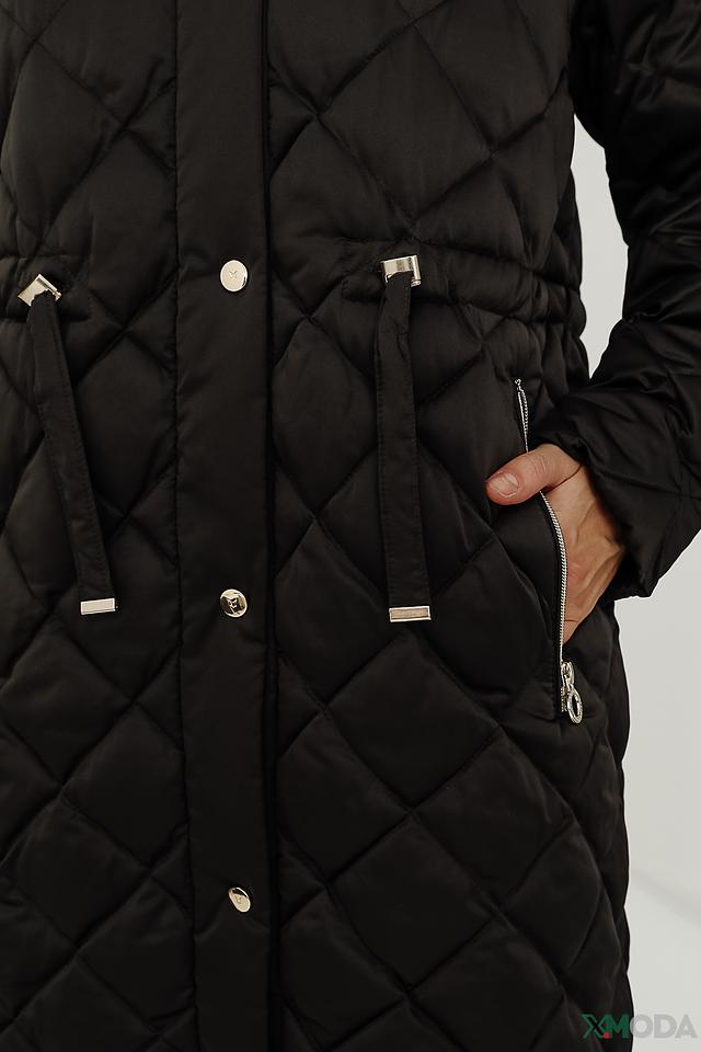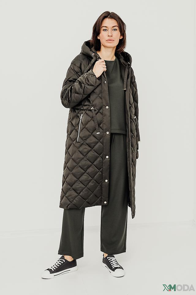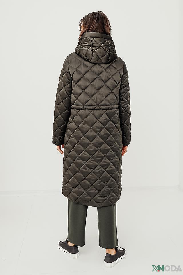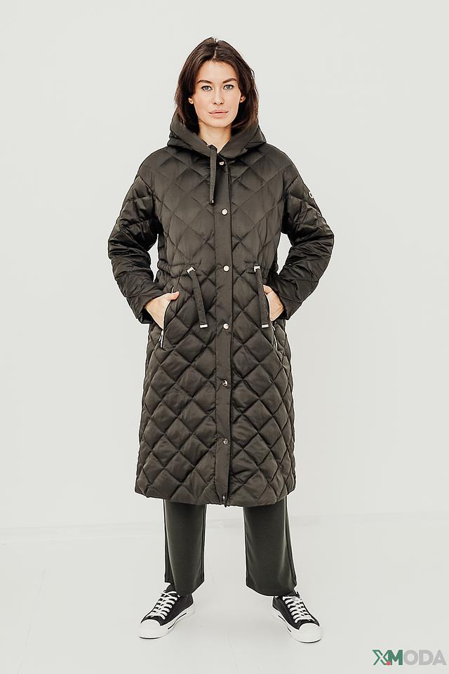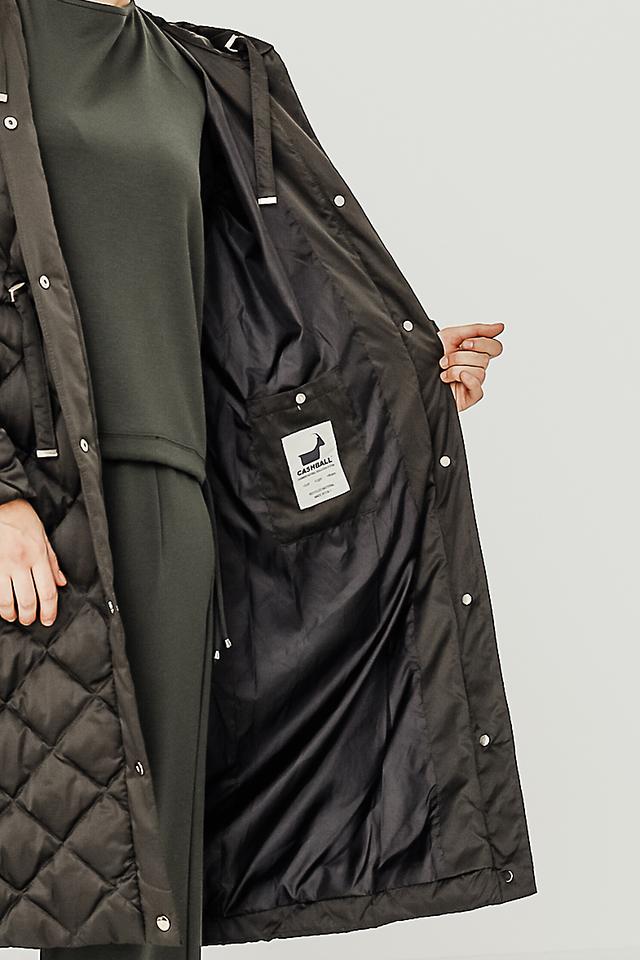 Особенностью этого пальто является стеганая фактура, созданная с помощью ромбовидных швов. Такая текстура не только придает изделию стильный вид, но и способствует равномерному распределению утеплителя. Пальто застегивается на кнопки по всей длине, а также имеет капюшон с регулируемым шнурком.