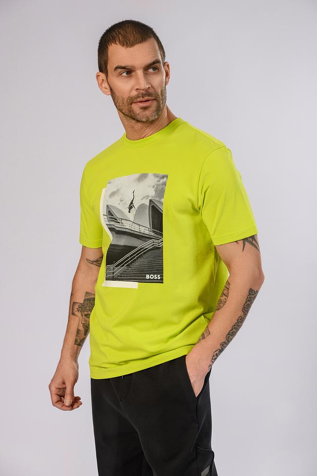 Мужская футболка Boss Green лаймового цвета с эффектным графическим принтом. Изготовлена из мягкого хлопка с добавлением эластана для комфорта и свободы движений. Стильный и современный выбор для повседневного образа. Состав: хлопок 95%, эластан 5%