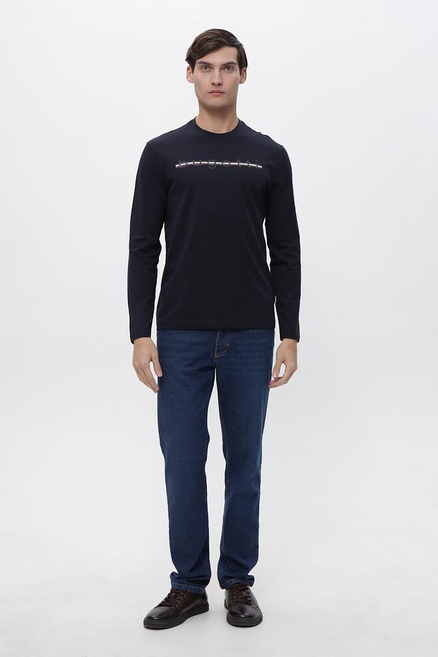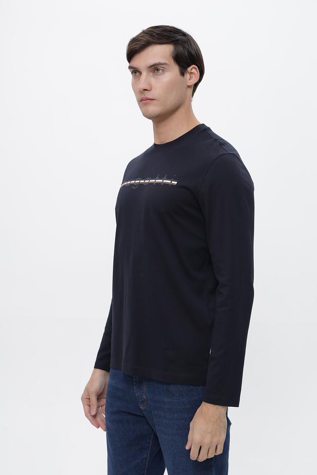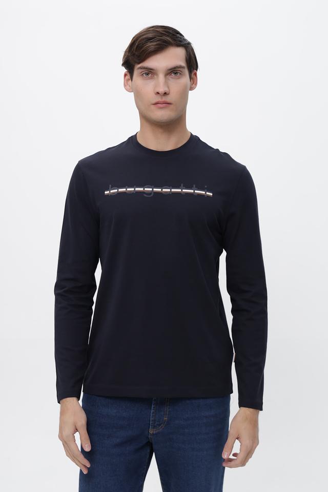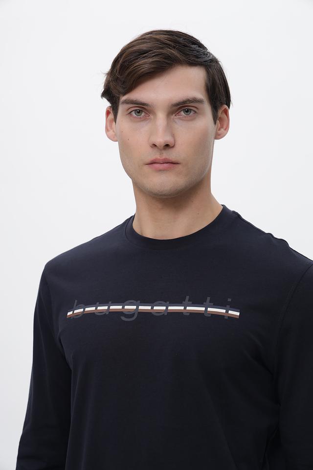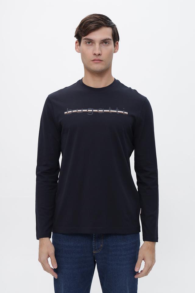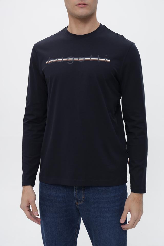 Мужской лонгслив Bugatti тёмно-синего цвета с декоративной полосой с логотипом бренда. Изготовлен из 100% хлопка, обеспечивающего комфорт и воздухопроницаемость. Состав: хлопок 100%