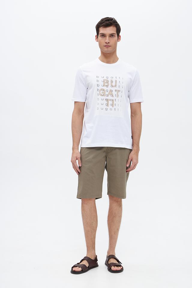 Футболка имеет классический прямой крой, который подходит для большинства типов фигур. Белый цвет делает ее универсальной основой для различных комбинаций в гардеробе. Особенностью данной модели является оригинальный принт с повторяющимся логотипом бренда Bugatti, выполненный в светло-сером цвете.