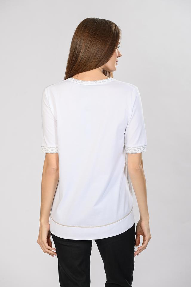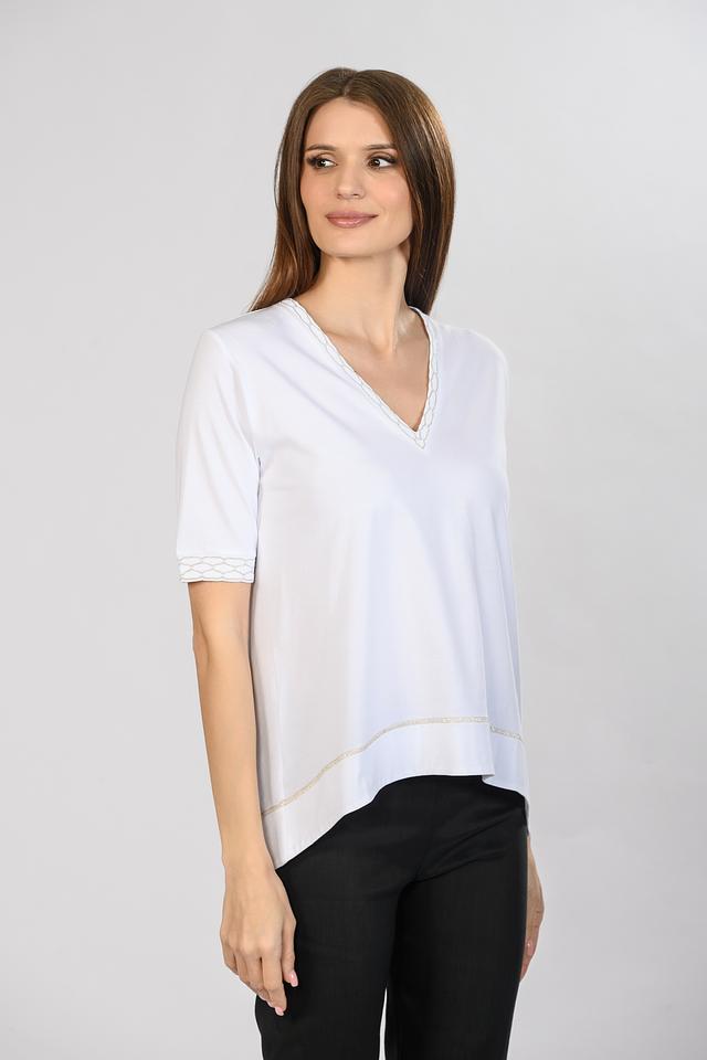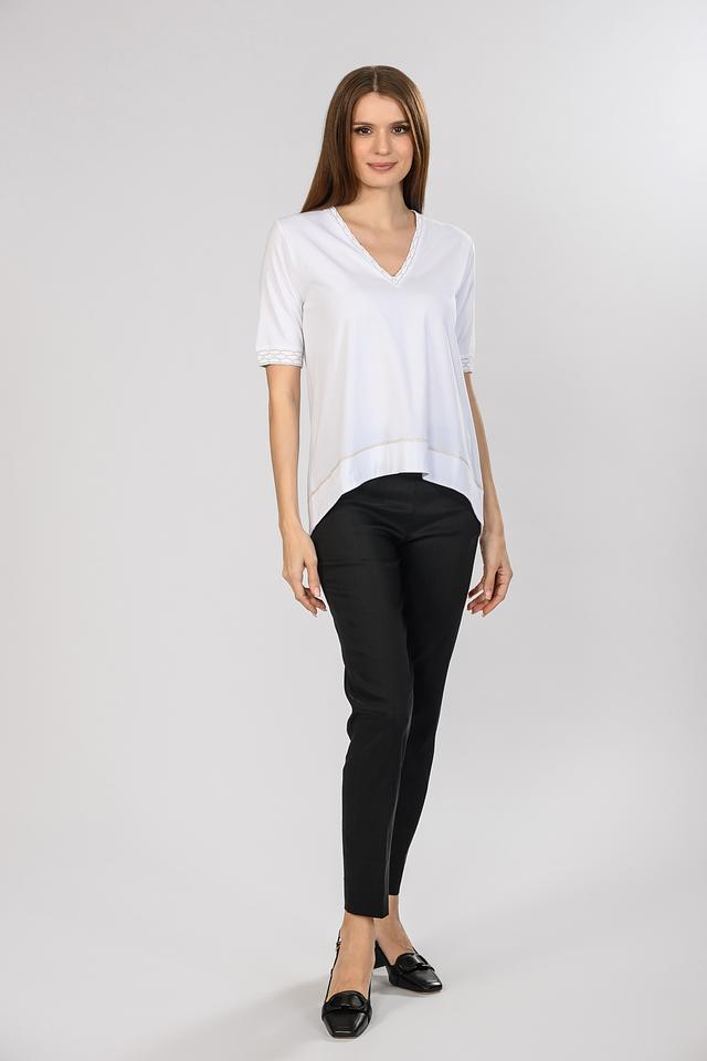 Белая футболка D. Exterior женского силуэта с V-образным вырезом и деликатной отделкой. Модель выполнена из мягкой вискозы с добавлением полиамида и полиэстера для комфорта и износостойкости. Состав: вискоза 78%, полиамид 16%, полиэстер 6%