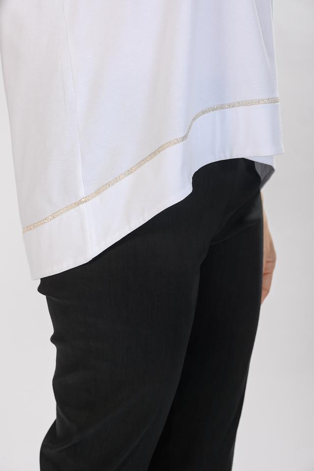Модель имеет V-образный вырез, который визуально удлиняет шею и подчеркивает женственность. Отделка по вырезу и на рукавах придает изделию изысканность и оригинальность.