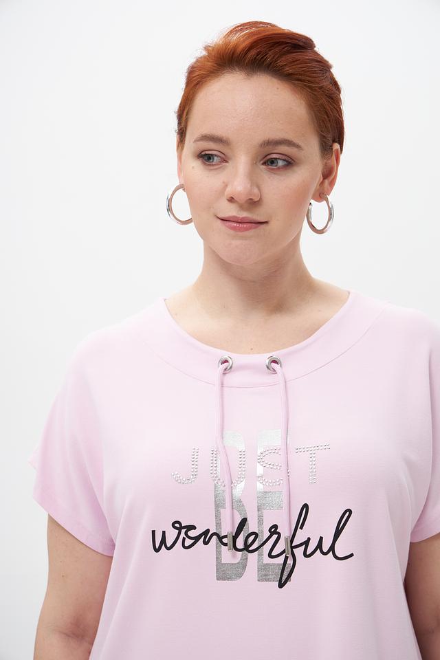 Футболка имеет круглый вырез горловины, дополненный декоративными шнурками. Передняя часть украшена надписью “Just Wonderful” выполненной в сочетании печатной графики и блестящих элементов.