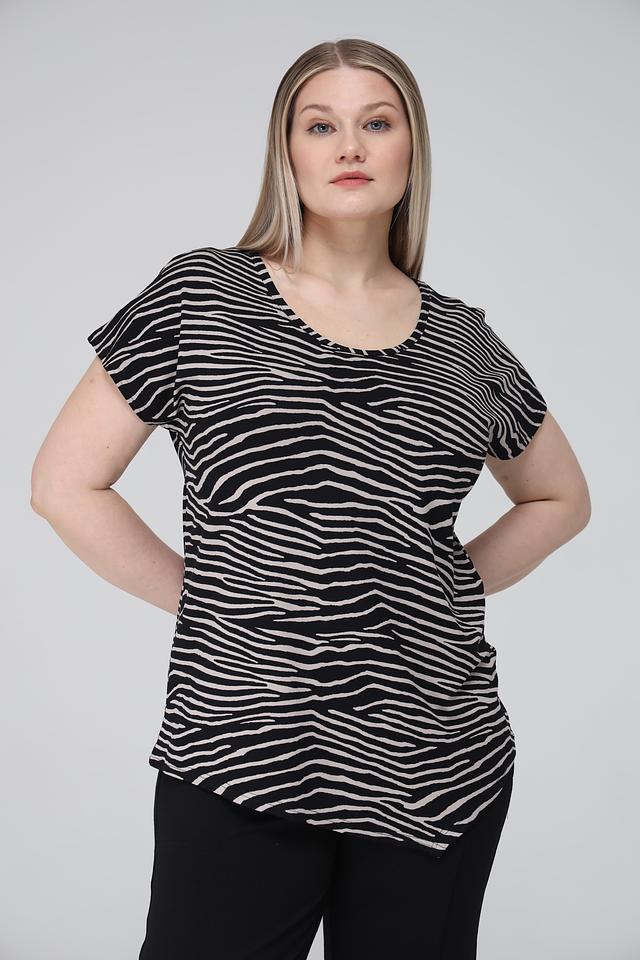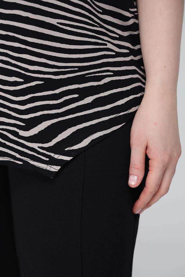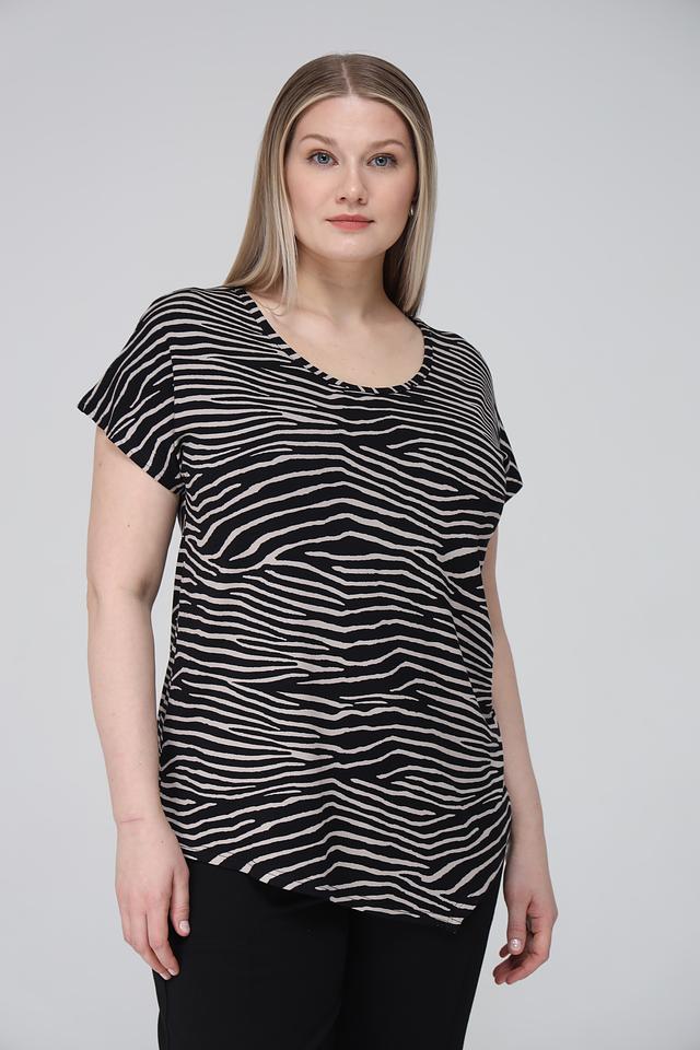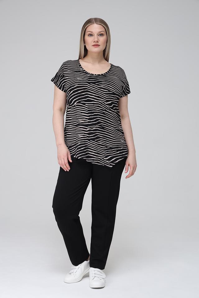 Футболка имеет прямой крой и короткие рукава, что делает её идеальной для повседневной носки. Оригинальный черно-белый полосатый принт добавляет образу динамичности и индивидуальности. Вырез горловины округлый, лаконичный.