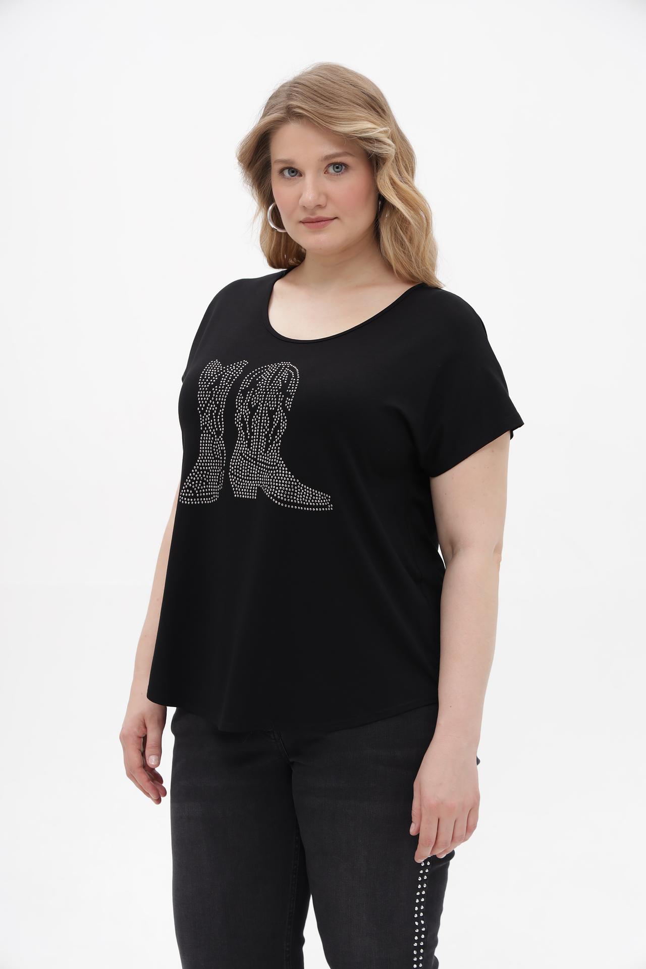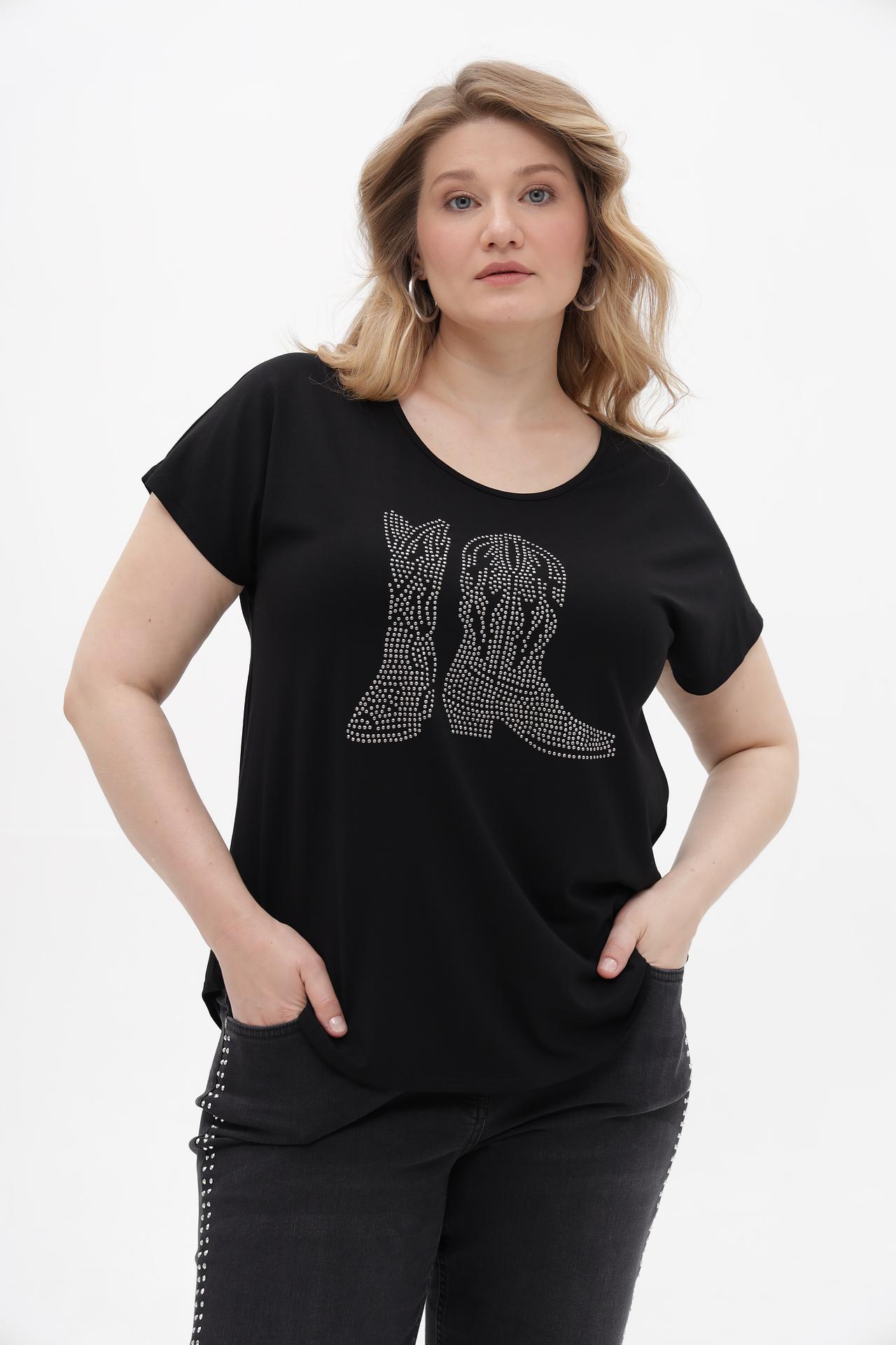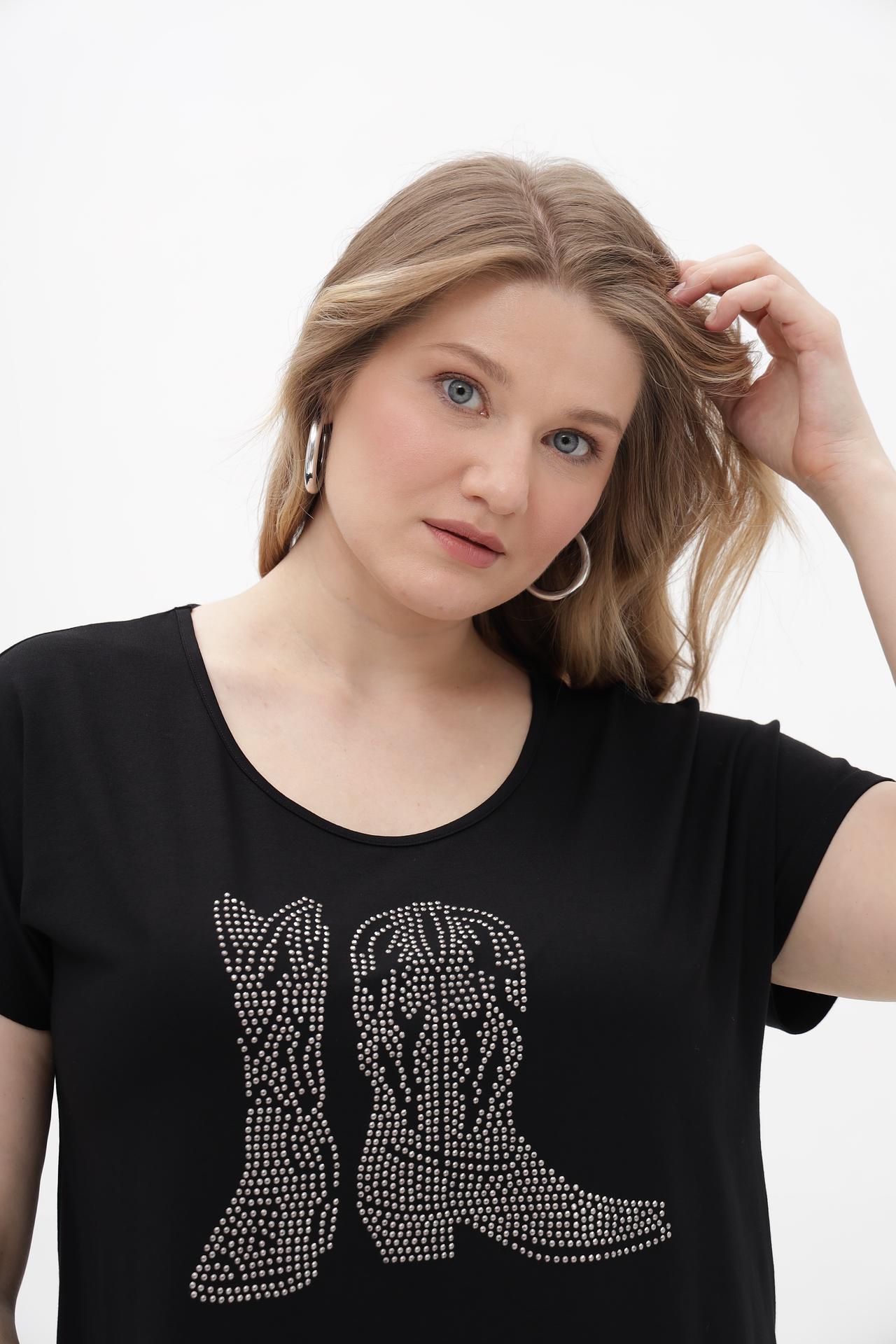 - Дизайн: Классический черный цвет дополнен эффектным принтом из страз в виде ковбойских сапог, придающим уникальность.