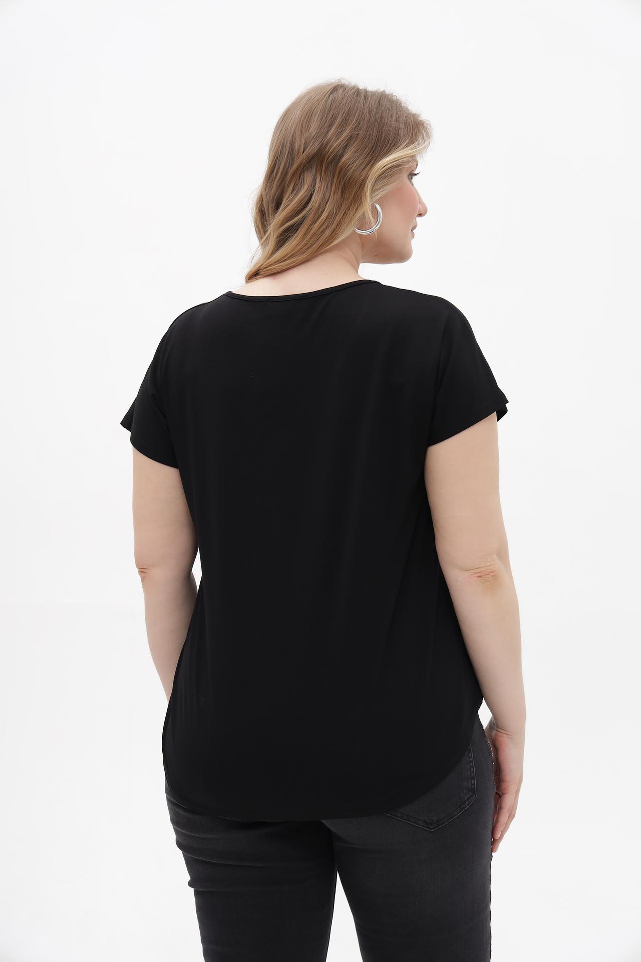 Материал футболки состоит из 94% вискозы и 6% эластана. Вискоза обеспечивает мягкость, воздухопроницаемость и приятные тактильные ощущения, а добавление эластана гарантирует идеальную посадку по фигуре и сохранение формы изделия даже после многочисленных стирок. Футболка прекрасно драпируется, подчеркивая достоинства силуэта.