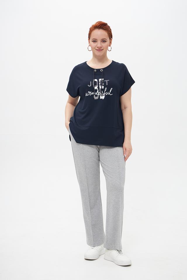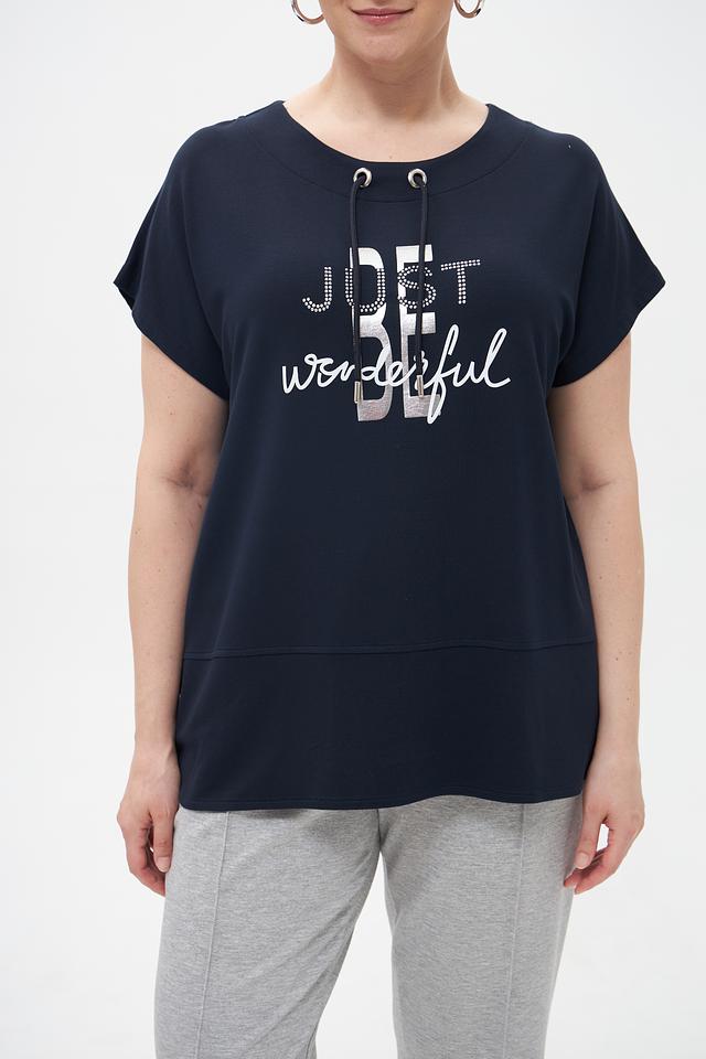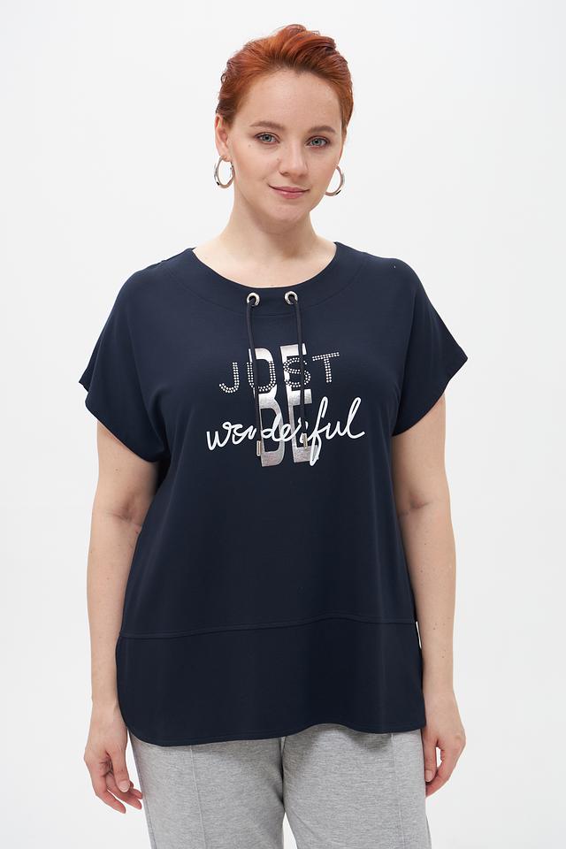 Женская футболка от Doris Streich темно-синего цвета с надписью и шнурками на горловине. Изготовлена из вискозы с добавлением эластана для комфорта и хорошей посадки. Состав: вискоза 95%, эластан 5%