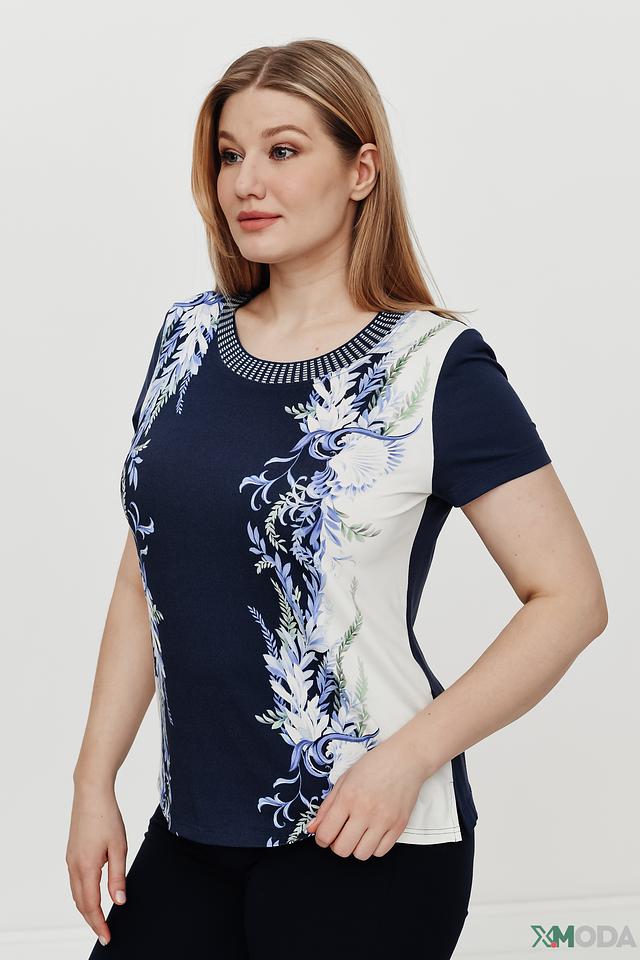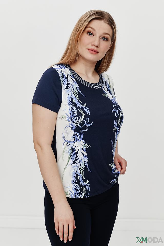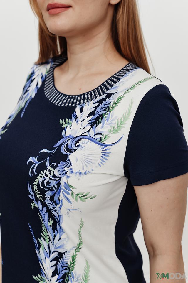 Женская футболка Eugen Klein темно-синего цвета с ярким цветочным принтом. Модель выполнена из мягкой вискозы с добавлением эластана, что обеспечивает комфорт и отличную посадку по фигуре. Состав: вискоза 93%, эластан 7%