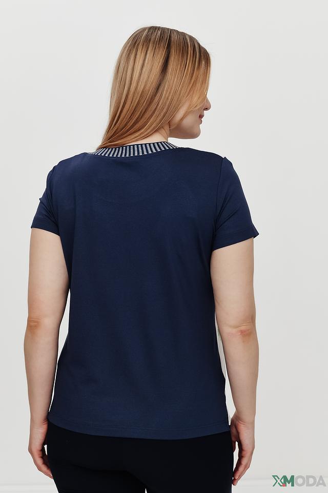 Круглый вырез горловины аккуратно отделан декоративной тесьмой с мелким рисунком, что добавляет изысканности. Короткие рукава делают футболку идеальной для теплой погоды. Состав ткани: 93% вискоза, 7% эластан.