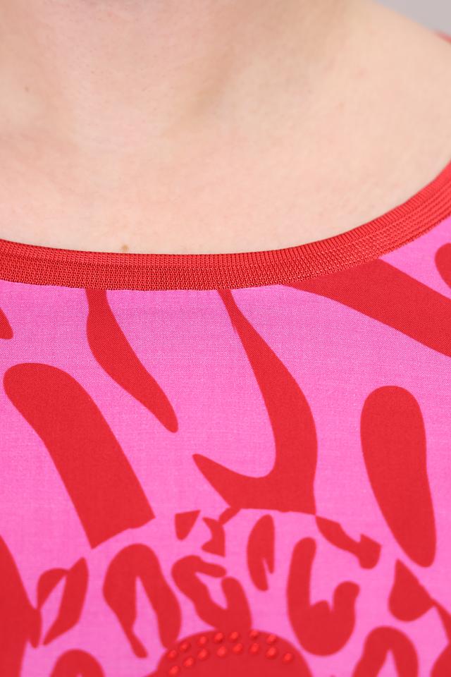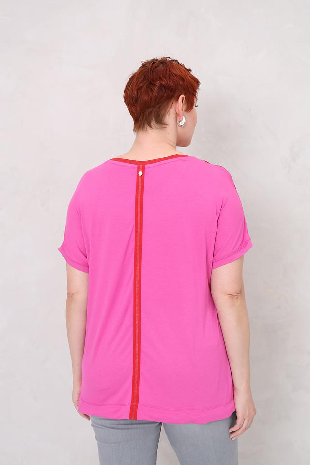 Женская футболка Frapp ярко-розового цвета с оригинальным принтом в виде губ. Модель свободного кроя с короткими рукавами выполнена из мягкой вискозы с добавлением эластана для комфорта и лучшей посадки. Состав: вискоза 90%, эластан 10%