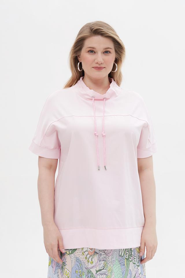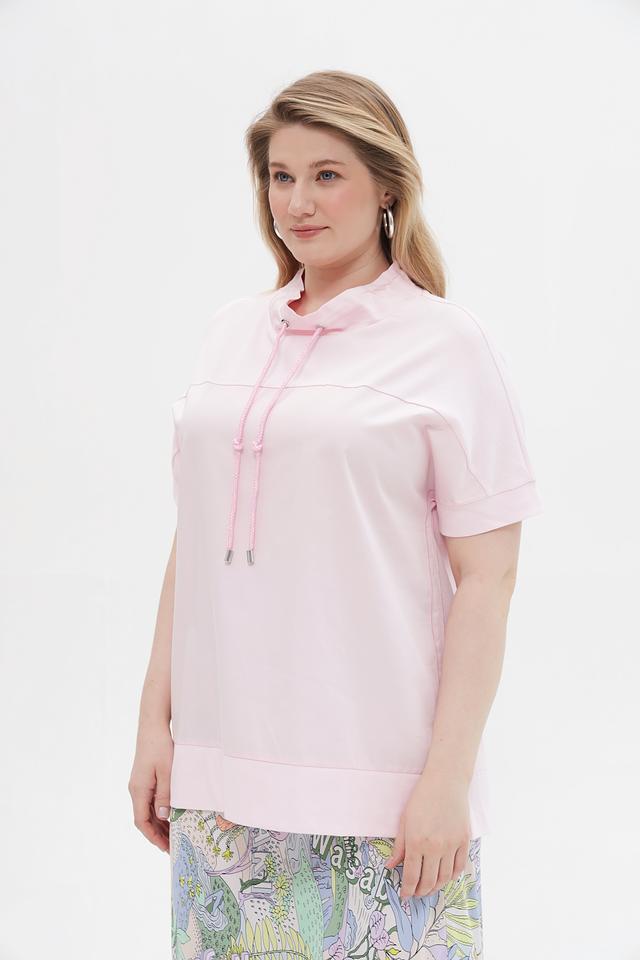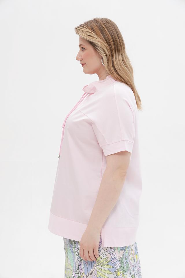 Женская футболка Frapp нежно-розового цвета с короткими рукавами и капюшоном на завязках. Изготовлена из мягкого хлопка с добавлением эластана для комфорта и свободы движений. Состав: хлопок 92%, эластан 8%