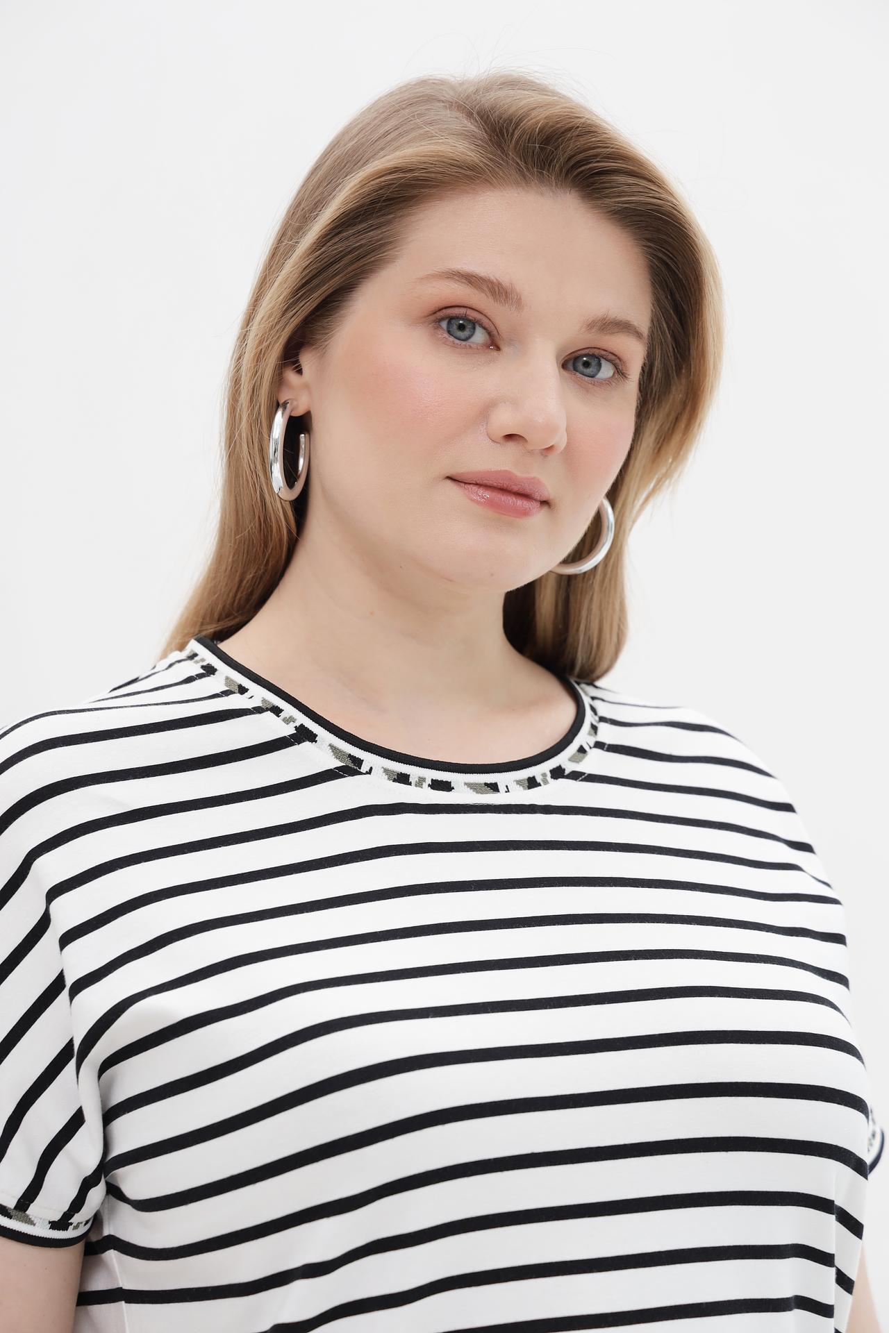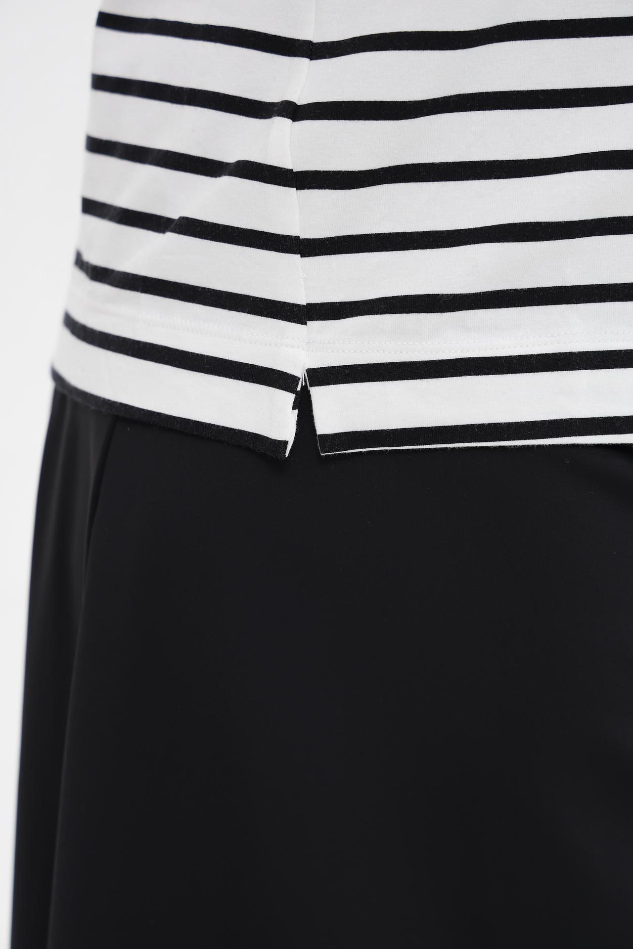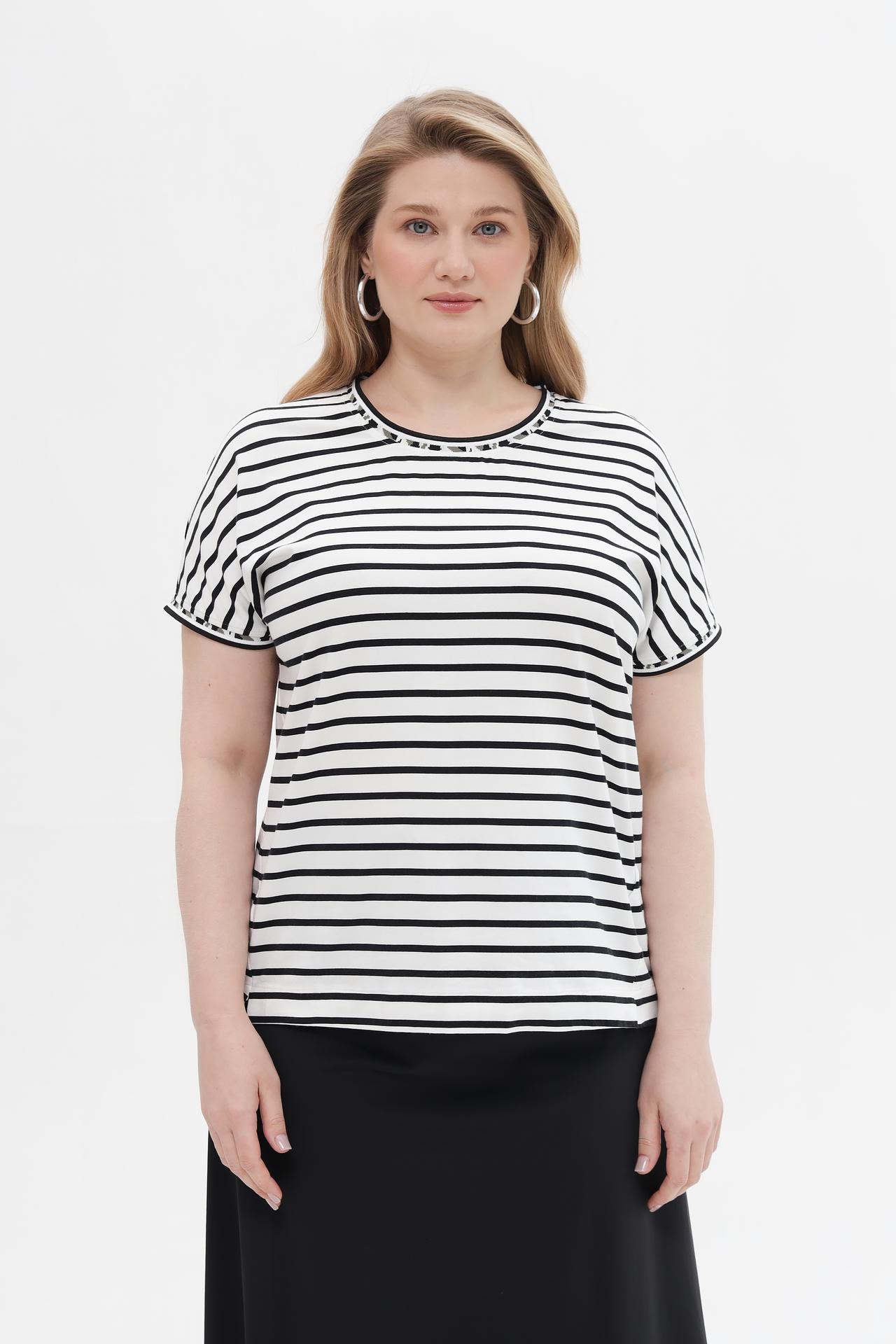 - Универсальный дизайн: Классический полосатый принт (белый с черным) делает эту футболку легко сочетаемой с джинсами, брюками или юбками. Она станет основой для множества стильных образов.