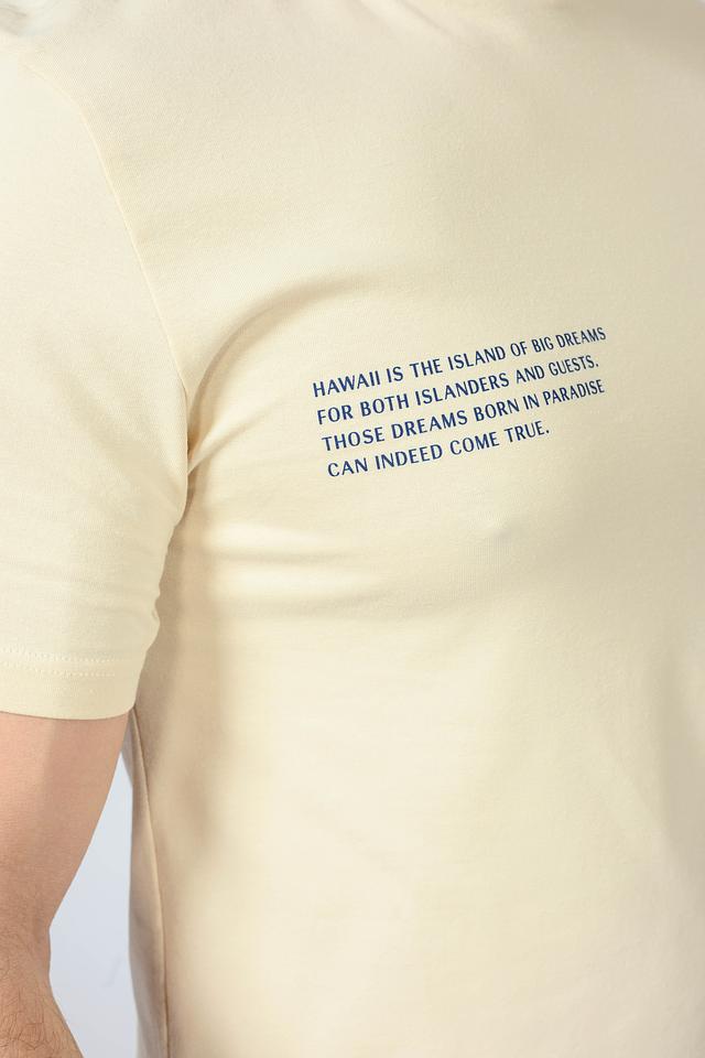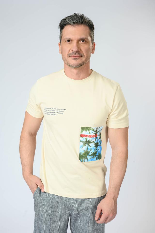 Мужская футболка Gaudi бежевого цвета с ярким принтом в виде пальм. Изготовлена из мягкого хлопка с добавлением эластана для комфорта и лучшей посадки. Стильный и удобный вариант для повседневного образа. Состав: хлопок 95%, эластан 5%