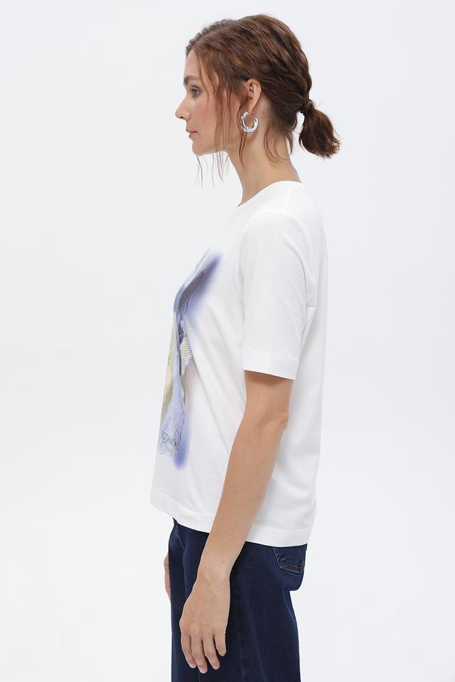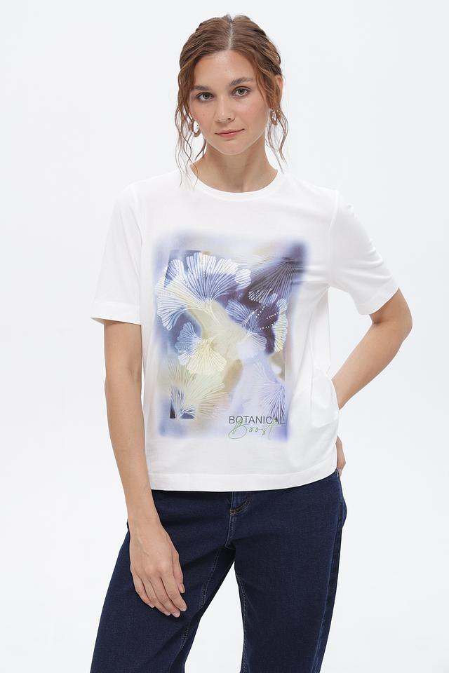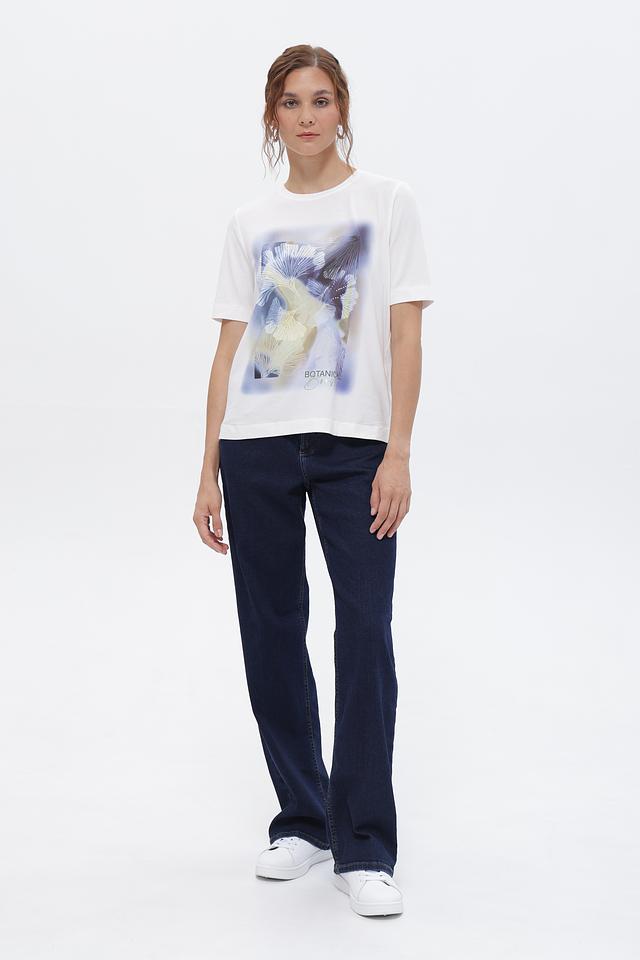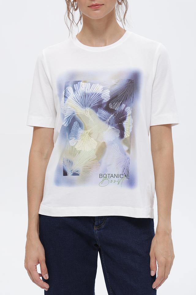 Белая футболка Gerry Weber с оригинальным цветочным принтом. Изготовлена из мягкого и приятного к телу материала на основе хлопка и модала. Стильный и комфортный вариант для повседневного образа. Состав: хлопок 47%, модал 47%, эластан 6%