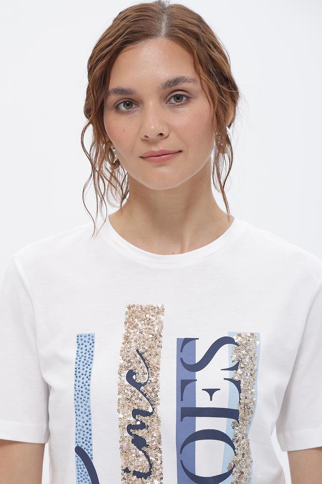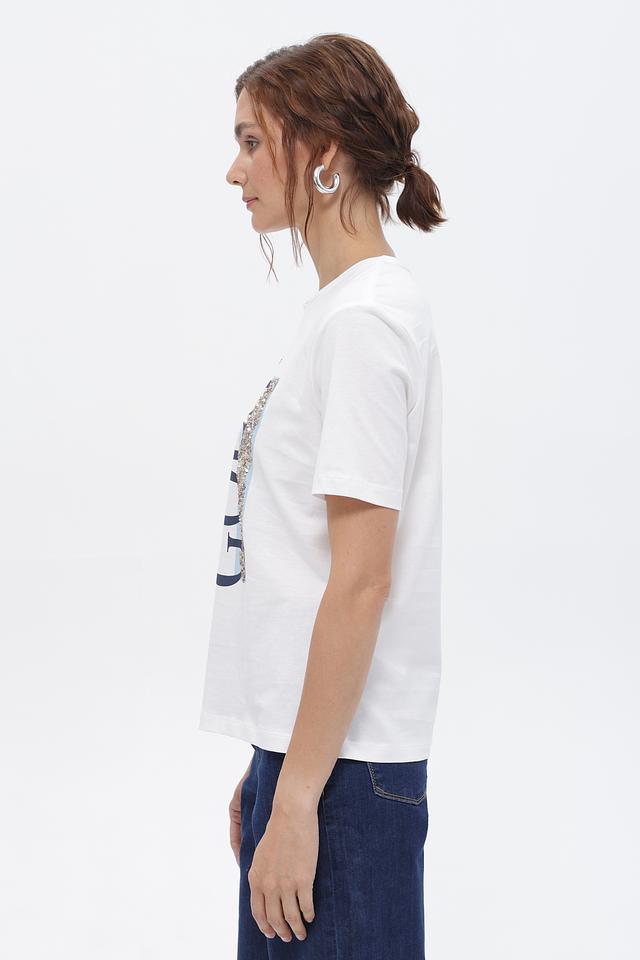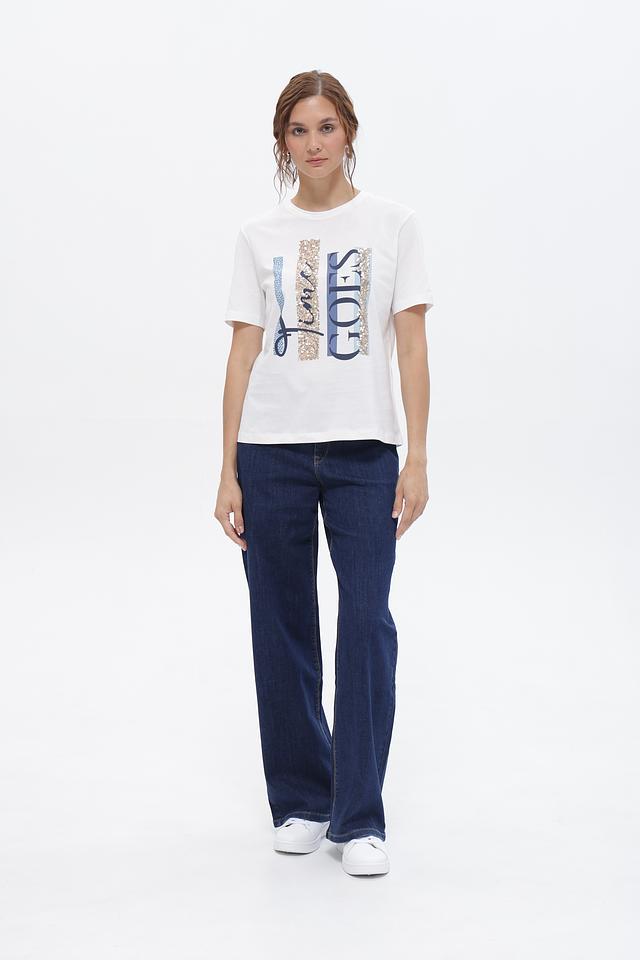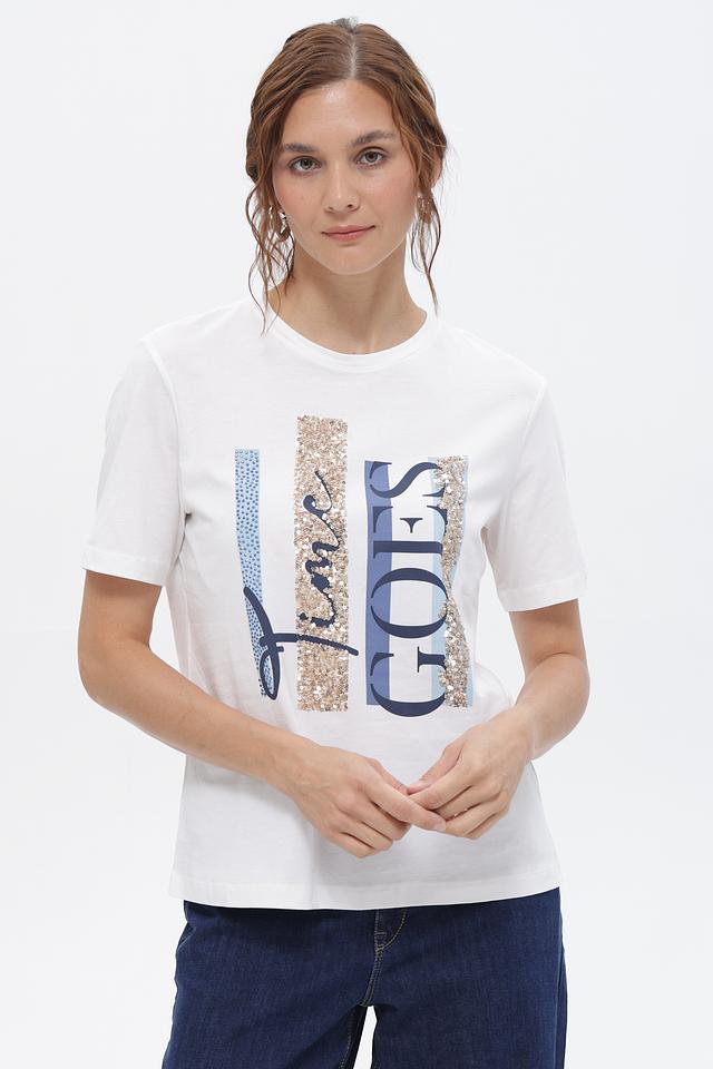 Принт сочетает в себе золотистые глиттерные вставки, синие элементы, напоминающие деним, и классический шрифт. Такая футболка станет ярким акцентом в вашем повседневном гардеробе.