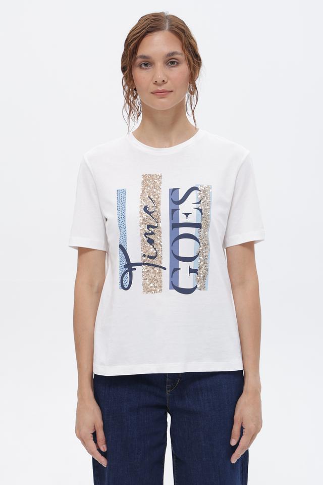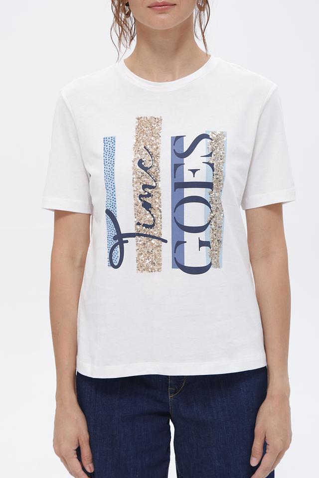 Футболка имеет прямой крой, круглый вырез горловины и короткие рукава. Главная особенность – эффектный принт с надписью “Time Goes” выполненный в различных стилях и с использованием декоративных элементов.