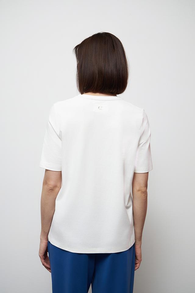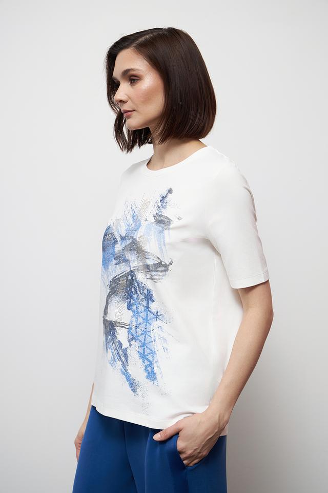 Белая футболка Gerry Weber EDITION с абстрактным сине-серым принтом. Модель из мягкого хлопка с добавлением эластана обеспечит комфорт и свободу движений. Идеальный выбор для создания стильного повседневного образа. Состав: хлопок 94%, эластан 6%