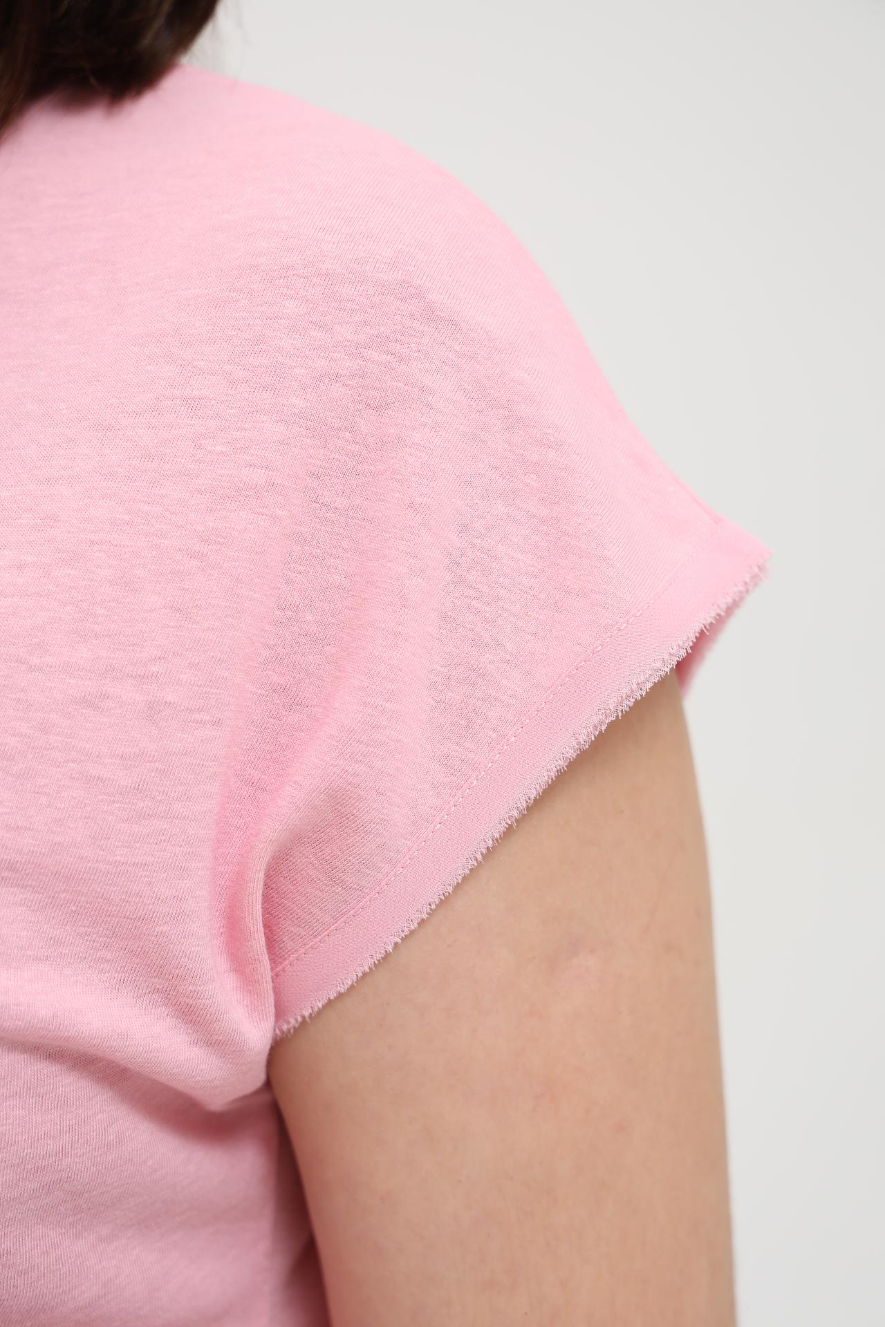 - Комфортный крой: Свободный крой и спущенная линия плеча обеспечивают максимальную свободу движений и комфорт в течение всего дня, а короткие рукава с необработанным краем добавляют актуальности.