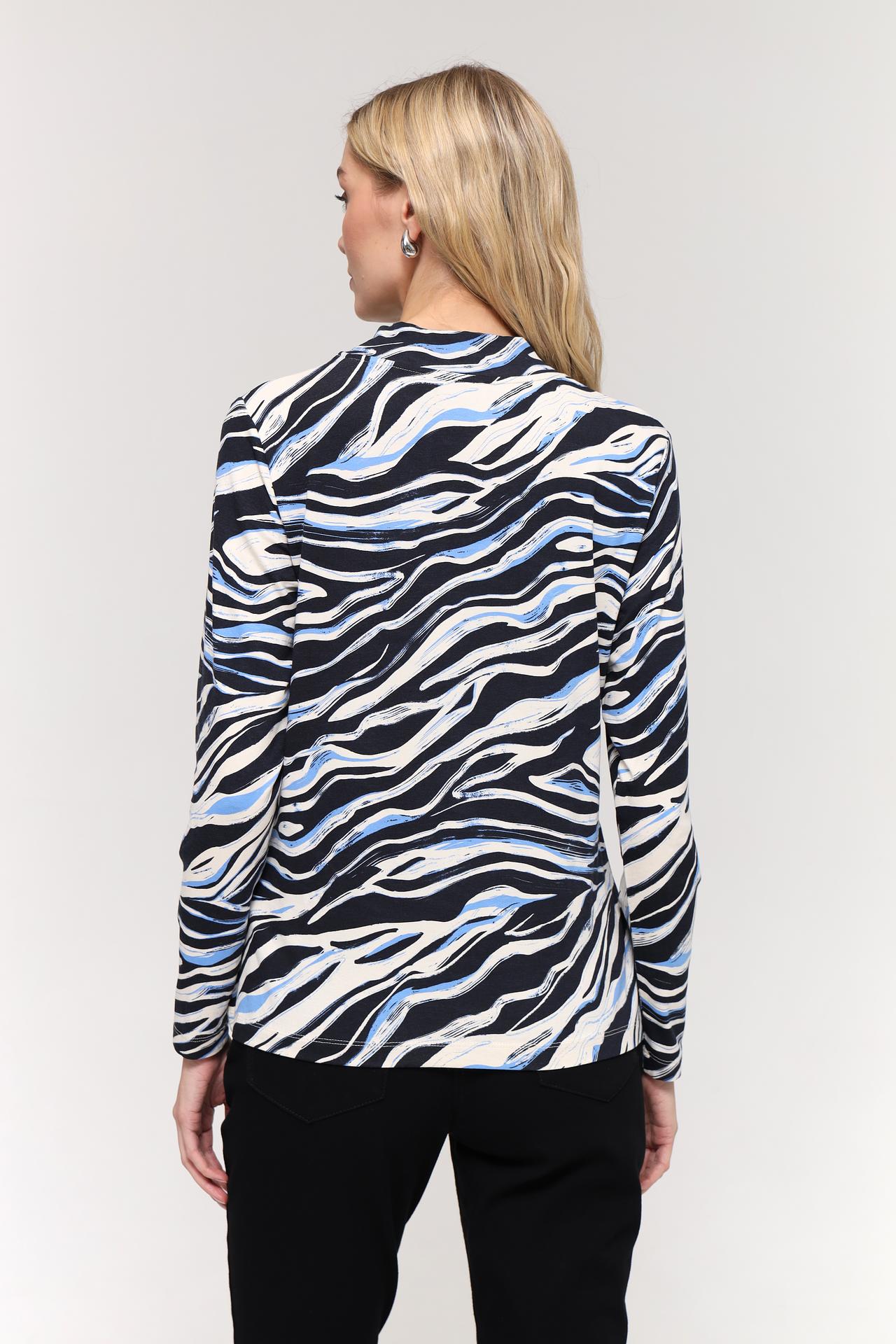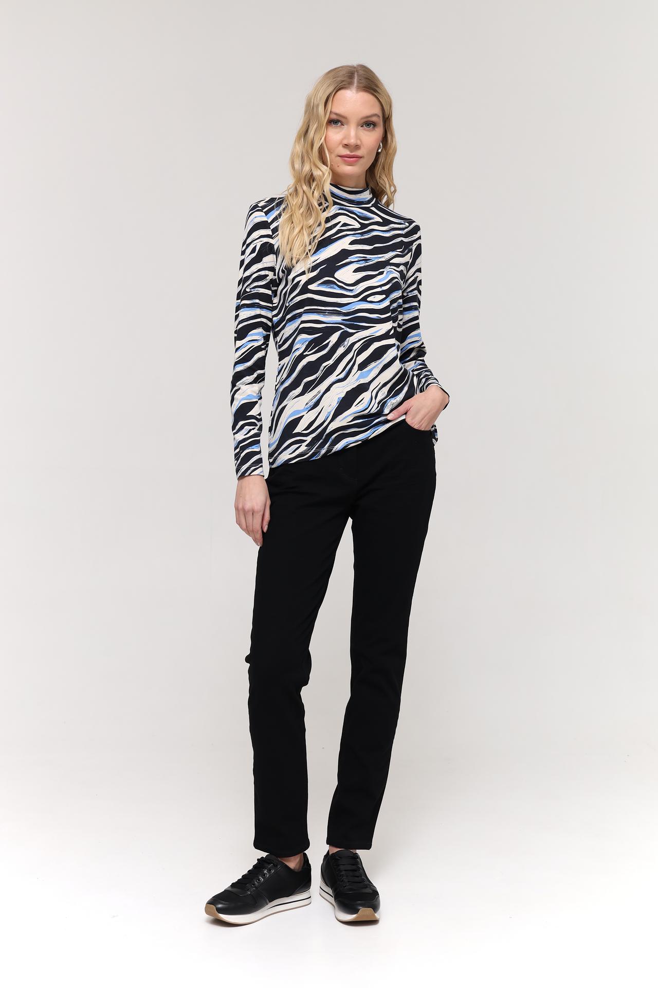 Футболка украшена эффектным принтом в виде абстрактных полос синего, белого и чёрного цветов. Вырез горловины – стойка, рукава длинные. Эта модель станет прекрасным дополнением к вашему гардеробу.