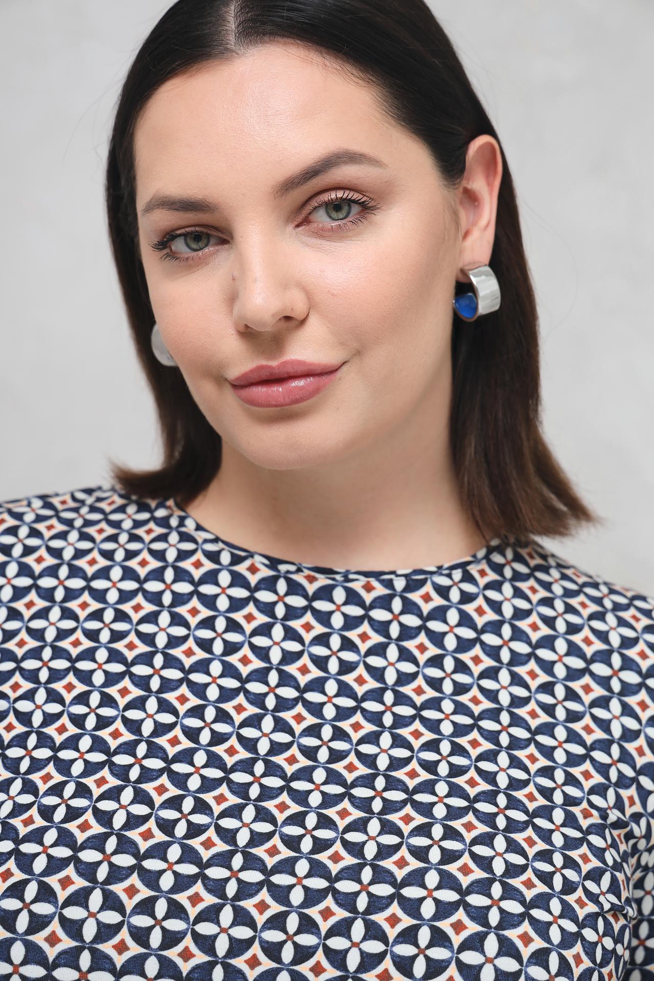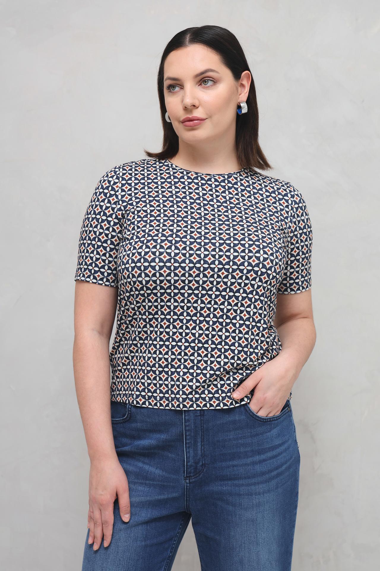 Темно-синий цвет изделия в сочетании с геометрическим принтом создает стильный и запоминающийся образ. Такая футболка легко комбинируется с различными элементами гардероба.