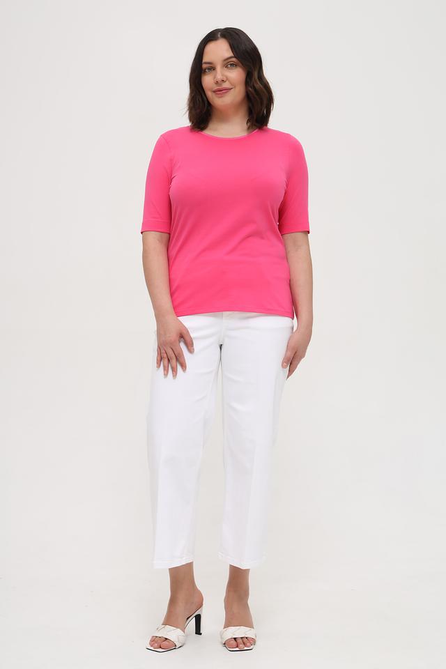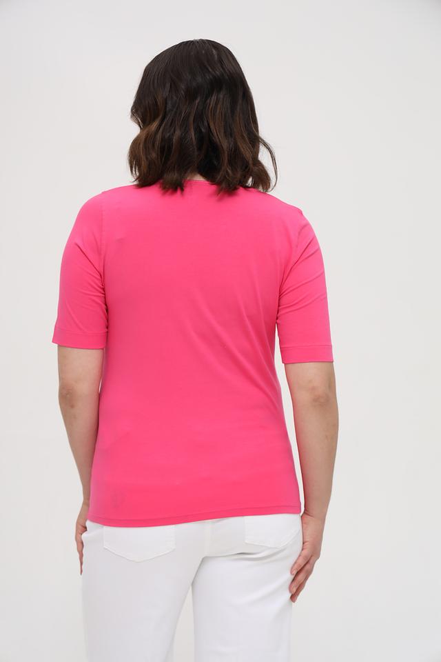 Футболка имеет прямой крой, короткий рукав и классический круглый вырез горловины. Яркий фуксиевый цвет добавит вашему образу свежести и женственности.