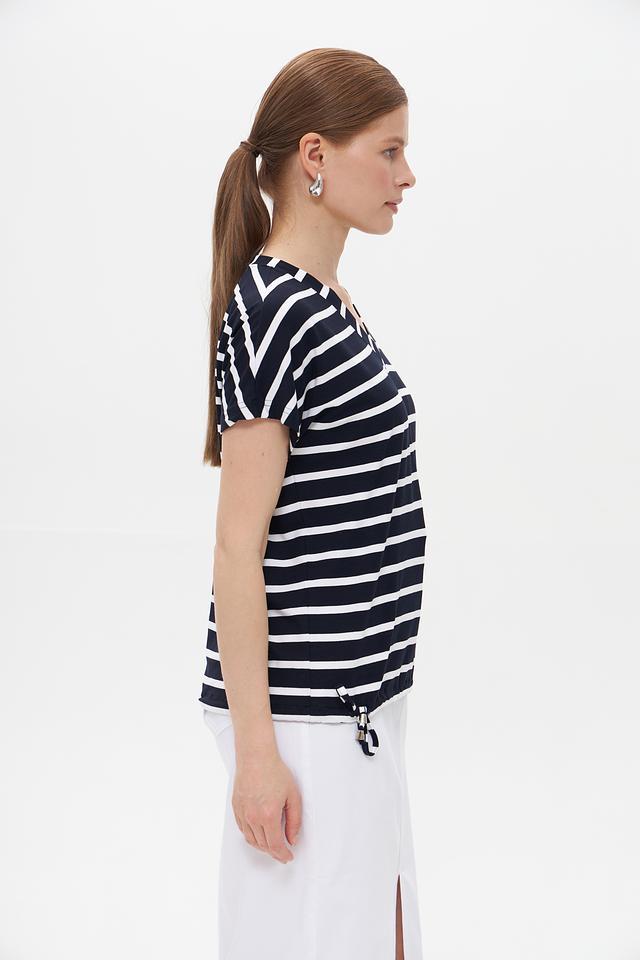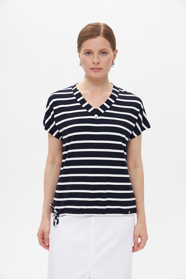 Футболка имеет свободный крой, не сковывающий движений, и подчеркивает женственность силуэта. Боковые сборки на талии с тонкими завязками позволяют регулировать посадку по фигуре и создавать более акцентированный образ.