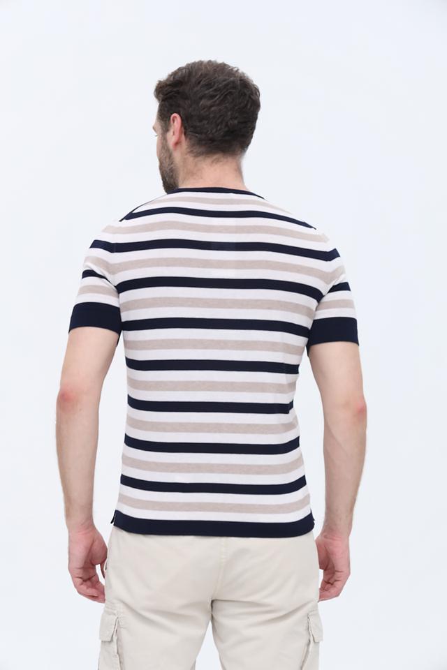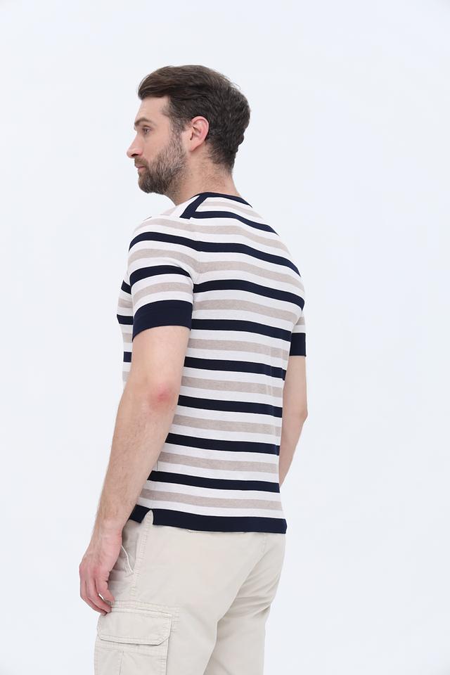 Футболка имеет круглый вырез горловины и короткие рукава. Цветовая гамма представлена в сочетании синего и бежевого, что придает ей элегантный и современный вид. Эта модель станет незаменимой частью вашего повседневного гардероба, обеспечивая комфорт и стиль в любой ситуации.