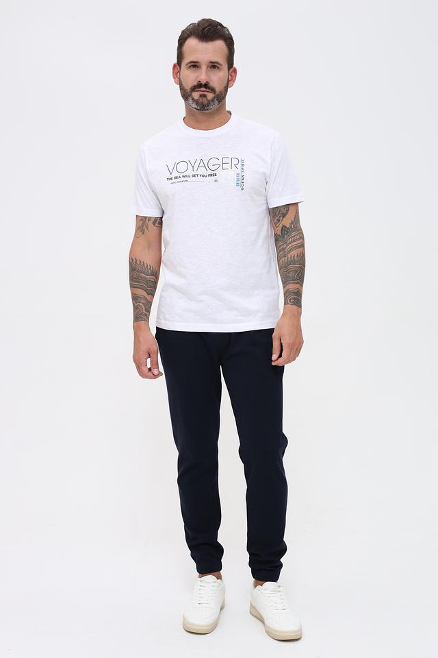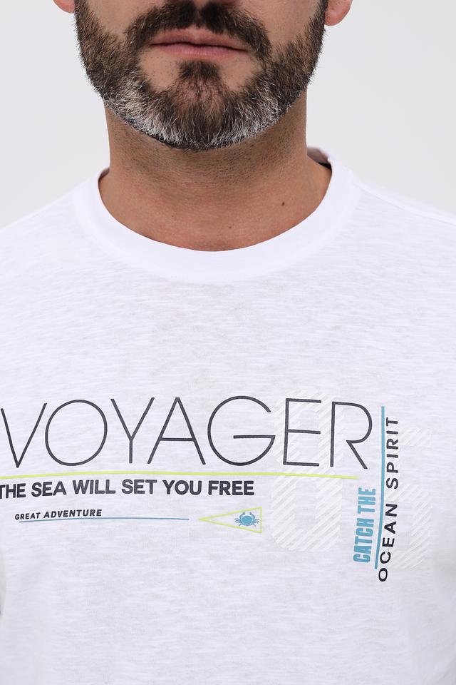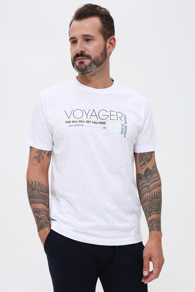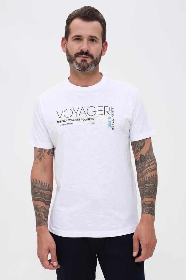 Футболка имеет классический прямой крой, который подходит для любого типа фигуры. Короткий рукав делает ее идеальным выбором для теплой погоды. Особенностью данной модели является яркий принт "Voyager" с морской тематикой, который добавляет образу оригинальности.