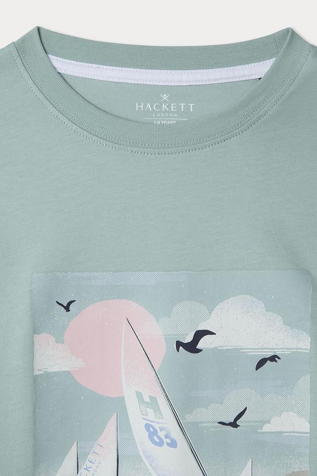 Эта детская футболка от Hackett London станет отличным дополнением к гардеробу юного модника. Футболка выполнена в нежном мятном цвете и украшена оригинальным принтом с изображением парусников и морского пейзажа.