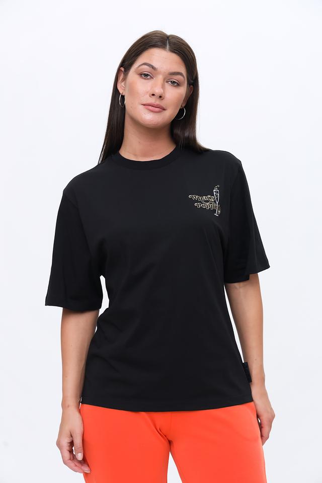 Модель имеет прямой крой и короткие рукава, что обеспечивает свободу движений и комфорт в жаркую погоду. На груди расположен яркий принт с изображением бокала шампанского и надписью "What's Poppin'", а на спине – более крупный графический элемент с аналогичной тематикой.