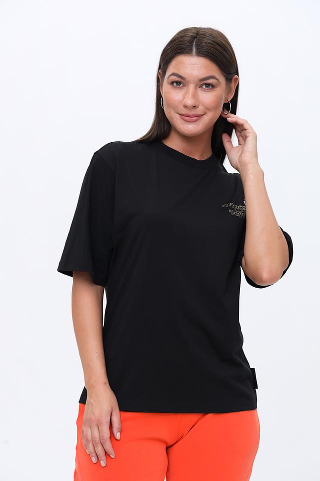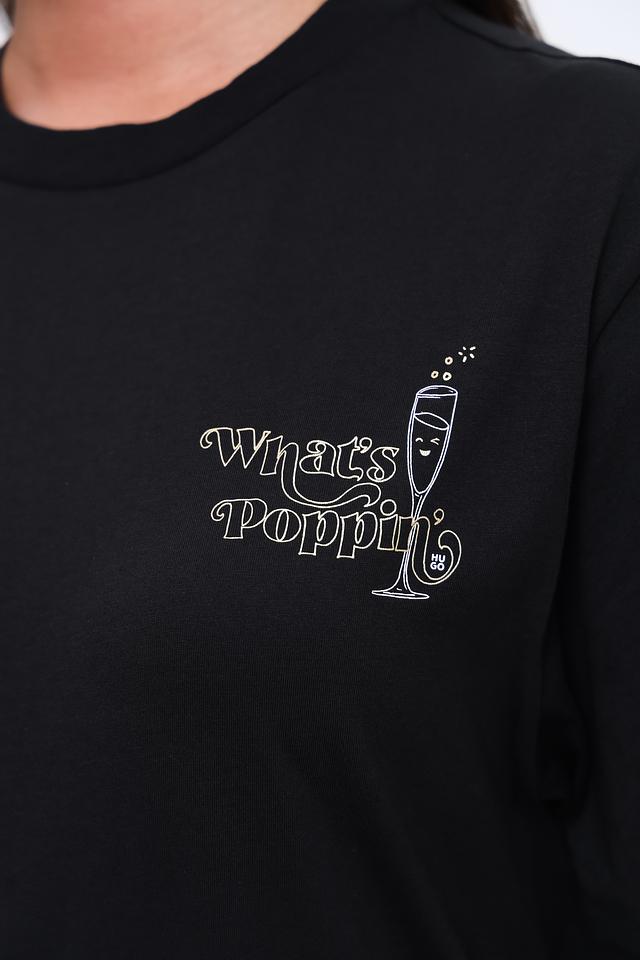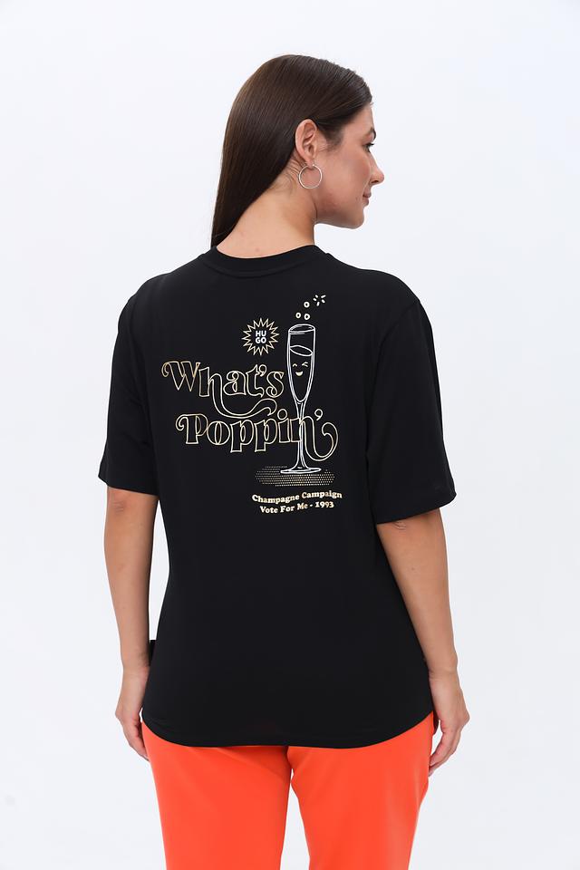 Чёрная футболка Hugo женского кроя с оригинальным принтом на груди и спине. Изготовлена из 100% хлопка, обеспечивающего комфорт и воздухопроницаемость. Стильный и лаконичный дизайн. Состав: хлопок 100%