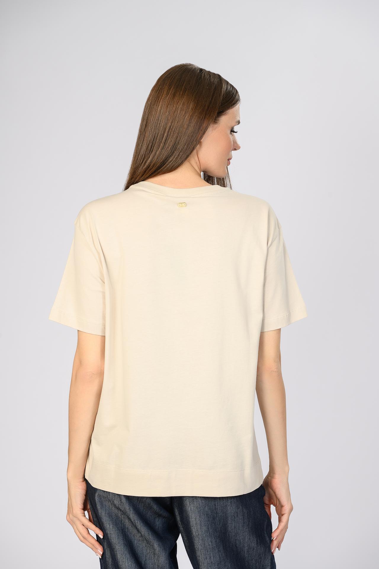 - Универсальный дизайн: Классический прямой крой и спокойный бежевый цвет позволяют легко интегрировать футболку в любой ансамбль. Она отлично смотрится как с джинсами, так и с юбками или брюками.