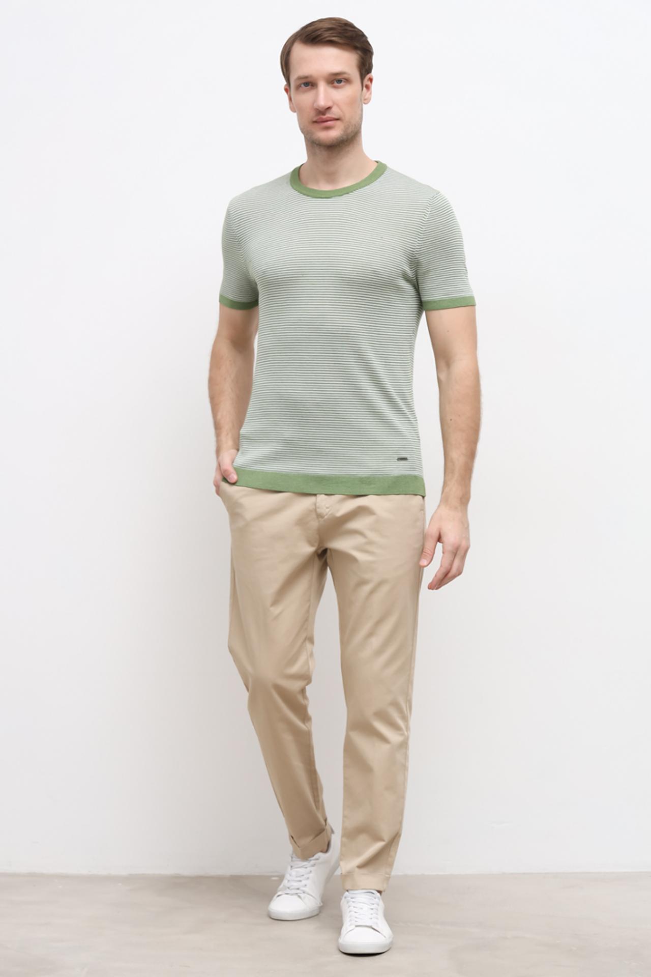 - Стильный полосатый принт: Горизонтальные полосы в сочетании с ярким зелёным кантом придают футболке современный и динамичный вид. Это классический элемент, который всегда актуален и легко интегрируется в различные образы.