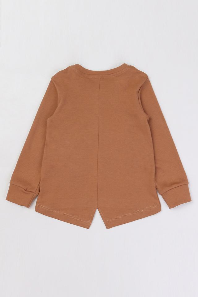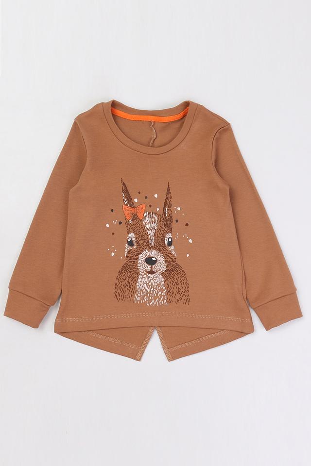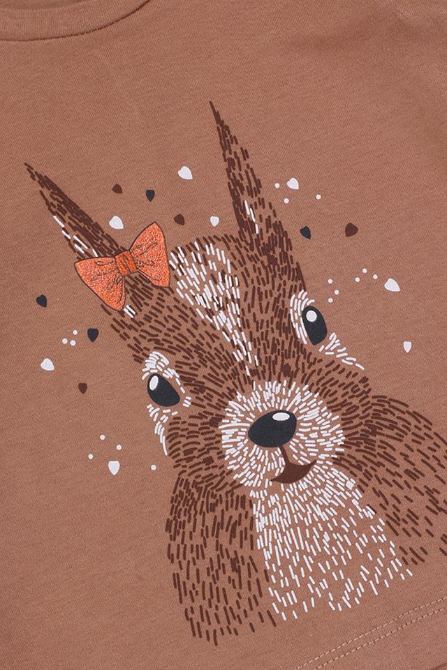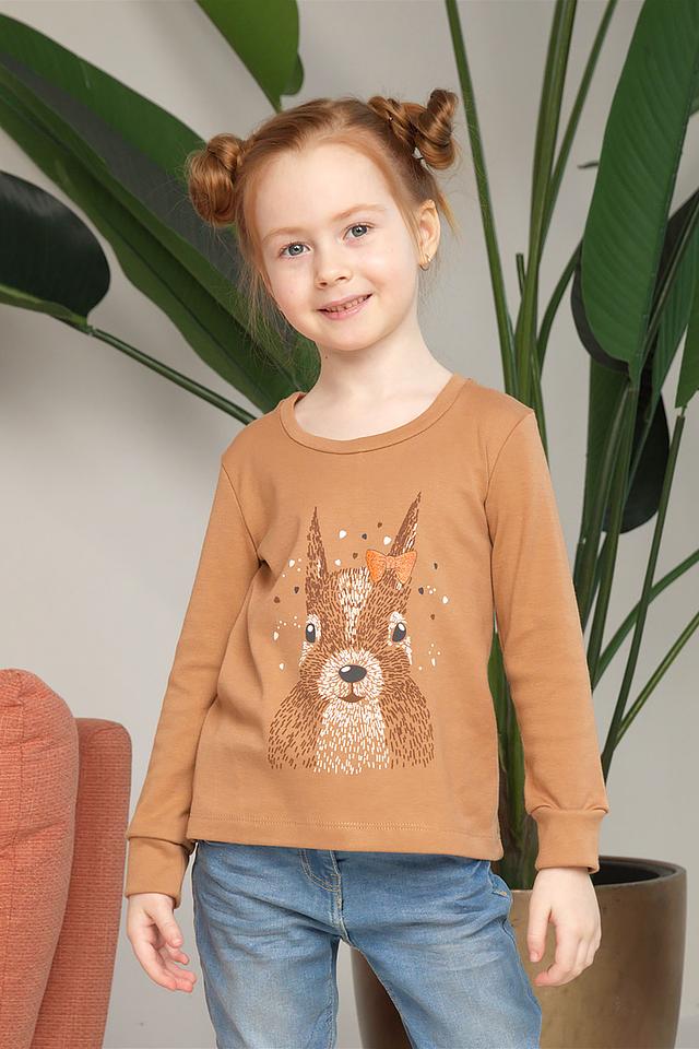 Футболка имеет длинный рукав, что делает ее актуальной для прохладной погоды. Округлый вырез горловины обеспечивает комфорт при носке. Оригинальный принт с изображением белки с бантиком украшает переднюю часть изделия.